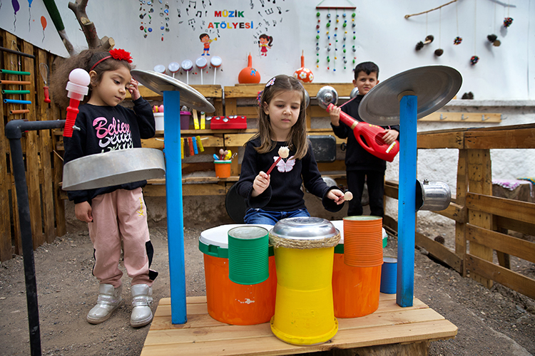 Geri dönüşüm malzemelerinden tasarlanmış oyun evleri, öğrenme atölyeleri, parkurlar, okuma ve dinlenme alanlarında vakit geçiren öğrenciler, toprakla uğraşıp bitki yetiştiriyor.