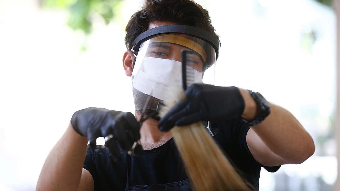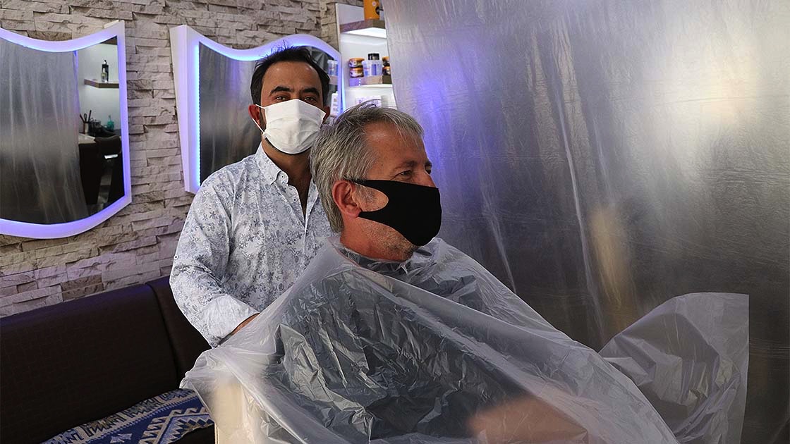 Önceden randevu alınması yoluyla sırası gelen müşteriler berber koltuğuna oturdu. Hem berberler hem de müşterilerin maske taktığı, bazı berberlerin ise siperli maske ile kendilerini koruduğu görüldü.