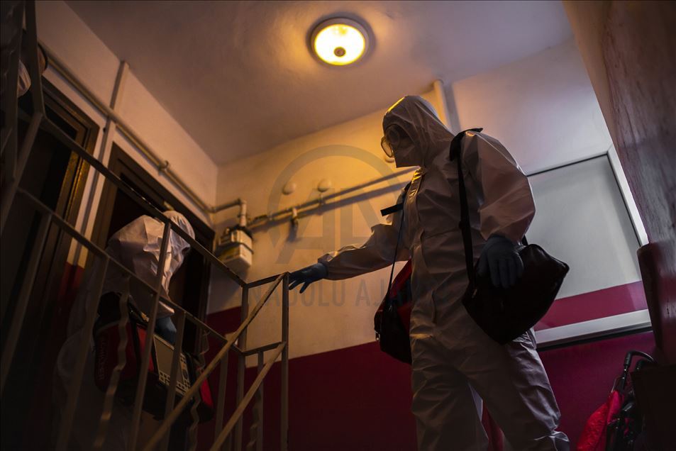 Kovid-19 şüphesi bulunan çağrıya gitmek için süratle tulum, galoş, maske, siperlik ve eldivenden oluşan koruyucu ekipmanını giyerek hazır hale gelen ekipler, verilen adrese ulaştıktan sonra hastanın ilk muayenesini yapıyor.