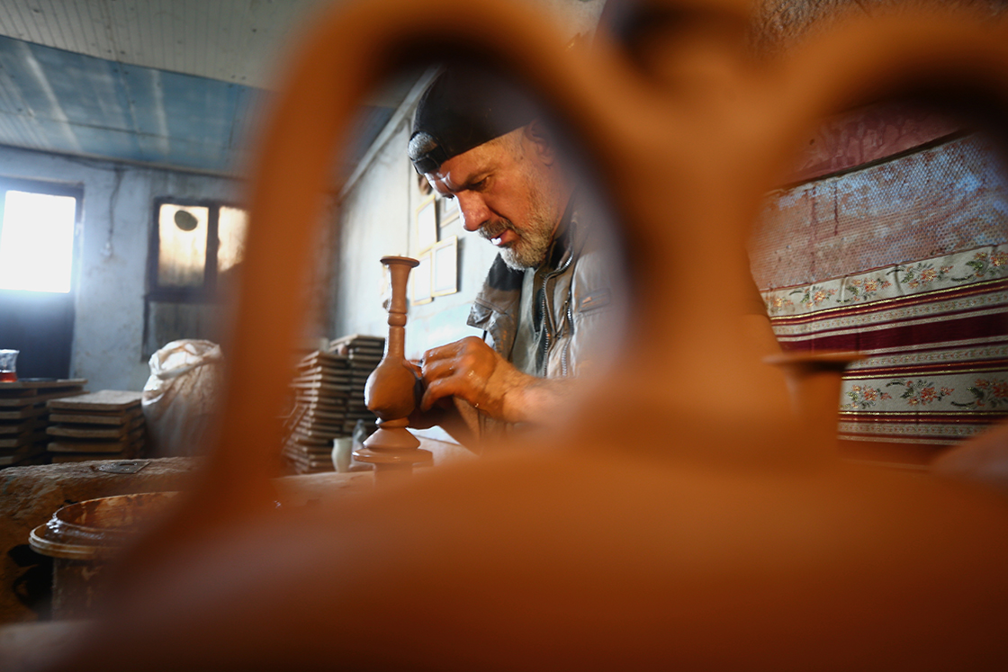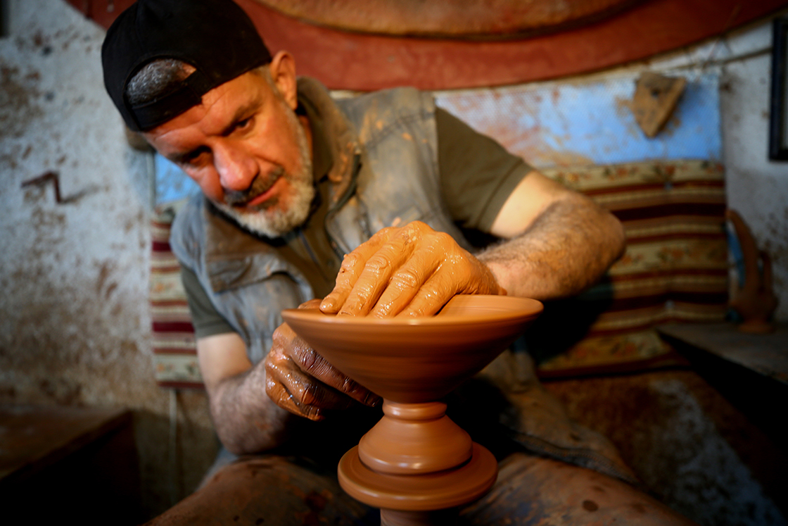 Küçük yaşlardan beri atölyelerdeki ustalarından öğrendiklerini geleneksel tezgahlarda şekil verdiği çamura aktaran 46 yaşındaki Osman Bircan, bölgedeki arkeolojik kazılarda ortaya çıkarılan ürünleri yeniden modelleyerek turistlerin ilgisini çeken aksesuarlara dönüştürüyor.