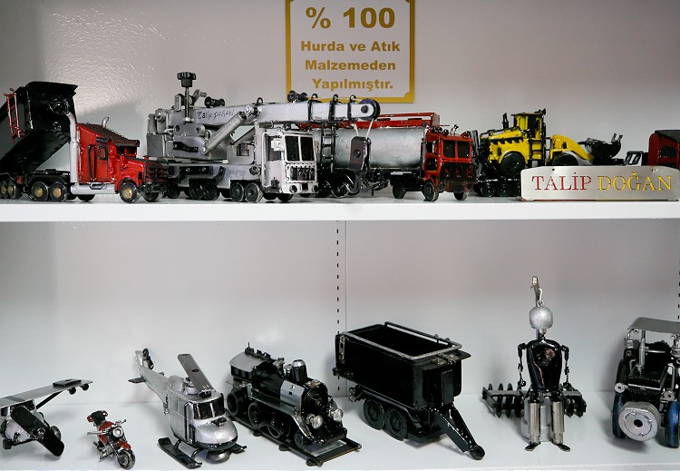 İzmir'de Sağlık Bilimleri Üniversitesi (SBÜ) İzmir Bozyaka Eğitim ve Araştırma Hastanesinde teknik eleman olarak çalışan Talip Doğan'ın hastanede hurdaya çıkan malzemelerden yaptığı iş makineleri, helikopter, motosiklet ve uçak gibi minyatür oyuncaklar, hastanede özel olarak sergileniyor.