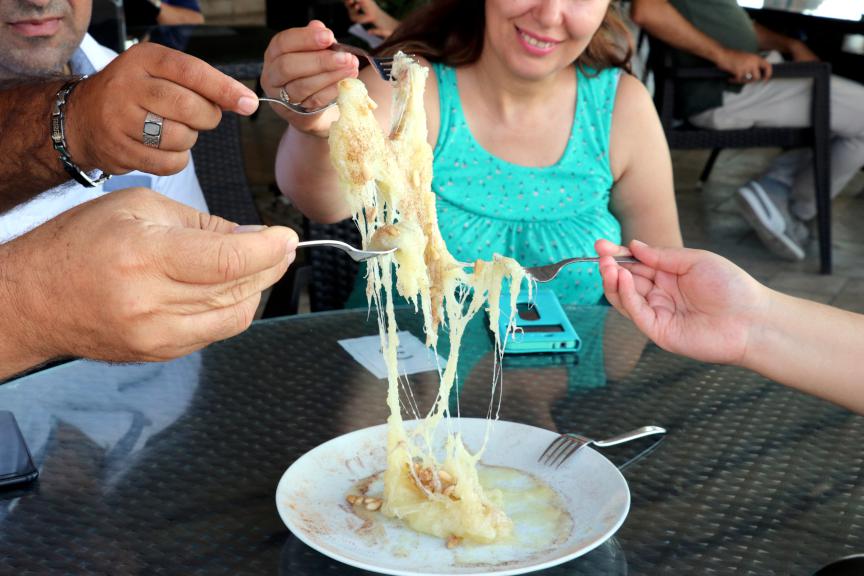 Künefesiyle dünyada ün yapmış olan gastronomi kenti Hatay'da, içerisindeki özel peyniri sayesinde yaklaşık 5 metreye kadar uzayabilen ve uzadıkça lezzetinin arttığı düşünülen peynirli irmik helvası ağızları tatlandırıyor.