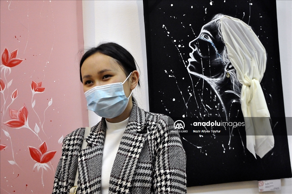 Ressam Alina Musayeva, sergi alanında, 2 saat hareketsiz duran ve yüzünde şiddetin izleri çizilmiş 5 genç kız ile aile içi şiddete ve toplumda sık sık gündeme gelen kız kaçırma olaylarına dikkati çekti.