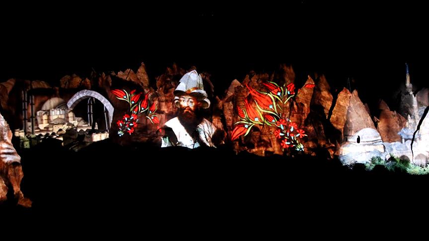 Türkiye'nin önemli turizm merkezlerinden Kapadokya'da, peribacalarının oluşumu ve geçmişte bölgede yaşayan uygarlıkları anlatan animasyon, "3D mapping" teknolojisi ile doğal yapılara yansıtılıyor.