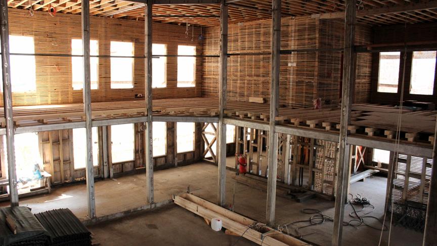 Bu kapsamda öncelikle betonarme bodrum katın üzerine ana bina ahşap karkası yapıldı. İki katlı ahşap binanın taşıyıcı dikmeleri ve dikme üstü kirişler meşe malzemeden, döşeme kirişleri lamine çam olarak imal edildi.