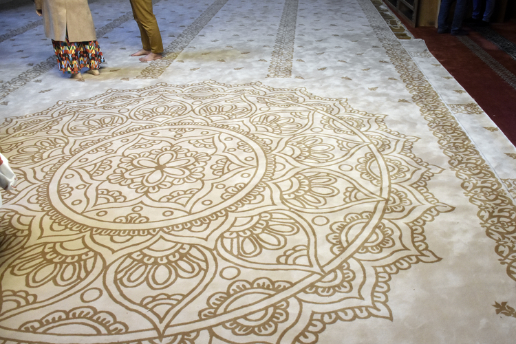 Camideki halılar açık renkte ve duvarlardaki hat sanatına uygun olarak yeniden üretildi.