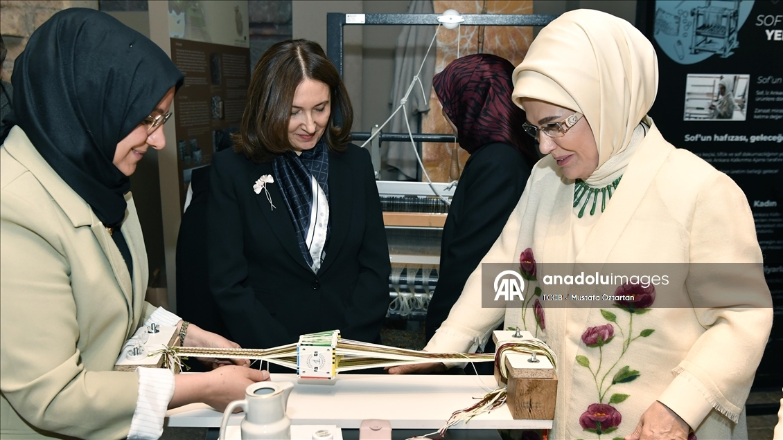 Emine Erdoğan, konuşmasının öncesinde 35 parçalık koleksiyondan oluşan "Anadoludakiler: Sof'un Zamansız Yolculuğu Sergisi'nin açılışını yaparak ürünleri inceledi.