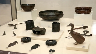 Açılış kurdelesinin sergiyi ziyarete gelen çocuklarla kesilmesinin ardından Kaleağasıoğlu, protokol üyelerine sergide bulunan savaş aletlerini tanıttı.