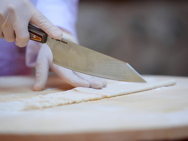 3. Açılan hamurların birbirine yapışmaması için un serpilerek 4-5 kat üst üste konulup, bıçakla ince ince kesilir.