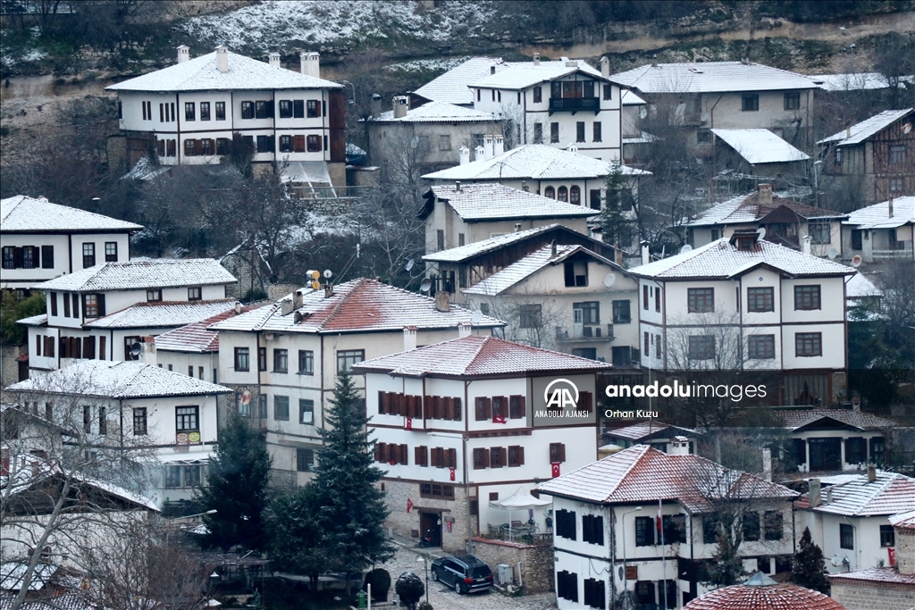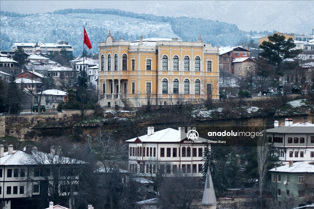 UNESCO Dünya Miras Listesi'nde yer alan tarihi konaklarıyla ünlü ilçede, dün başlayan kar yağışı aralıklarla devam etti.