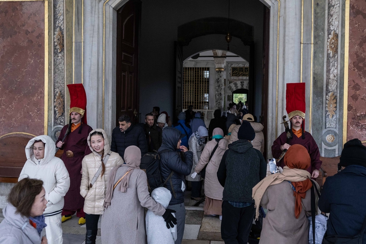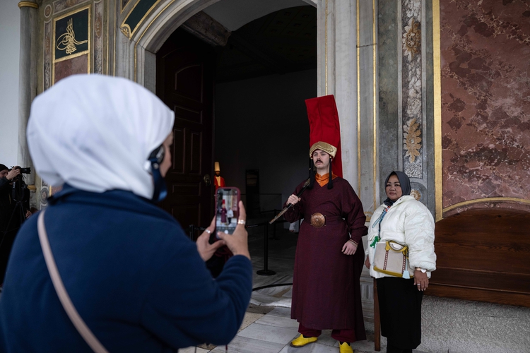 Cumhurbaşkanlığı bünyesindeki Milli Saraylar Başkanlığına bağlı Topkapı Sarayı'nın ziyaretçileri, Osmanlı'da Enderun'un en nüfuzlu siması ve amiri olan silahtarların kıyafetiyle nöbet tutan jandarmalar ile fotoğraf çektiriyor.