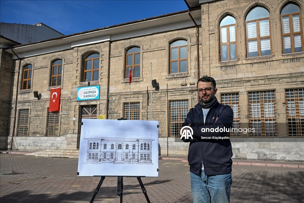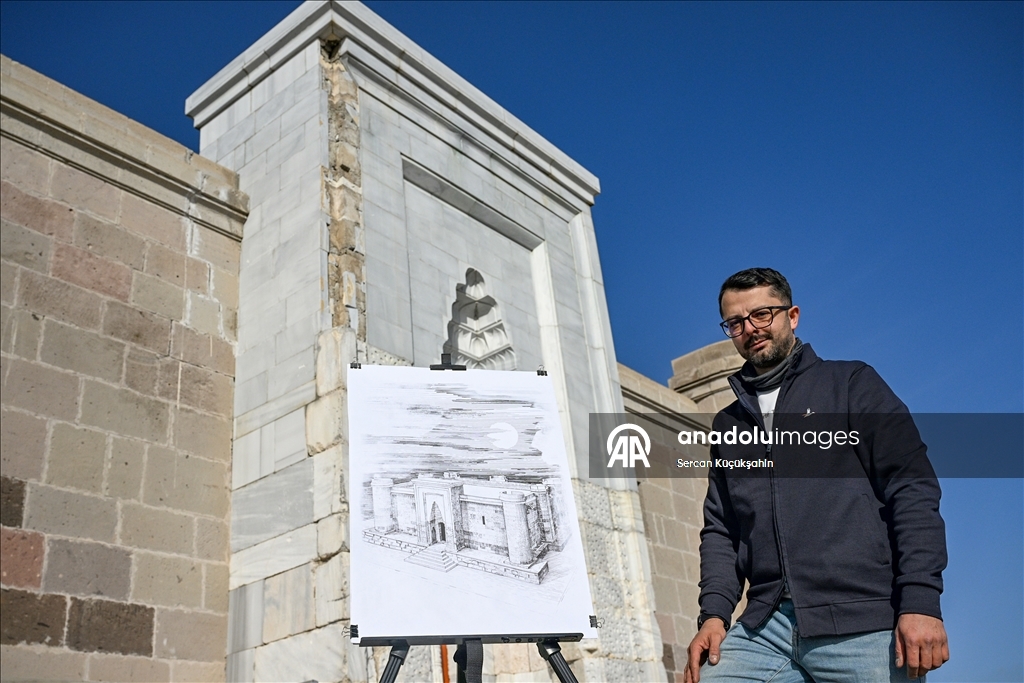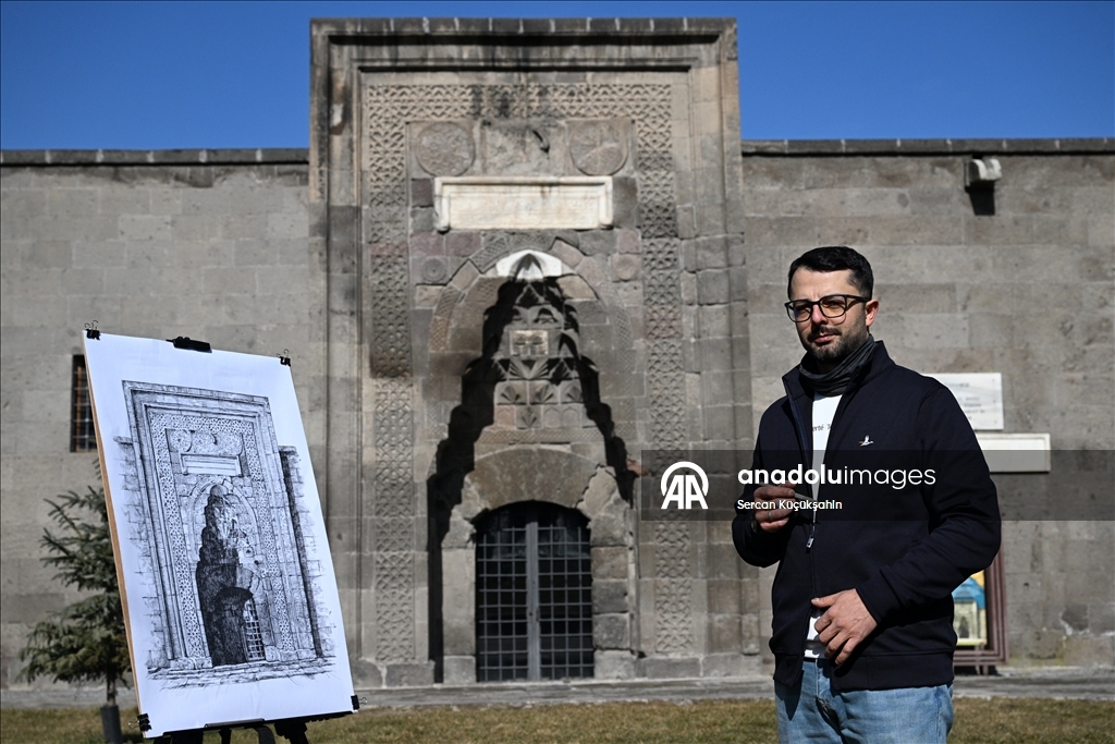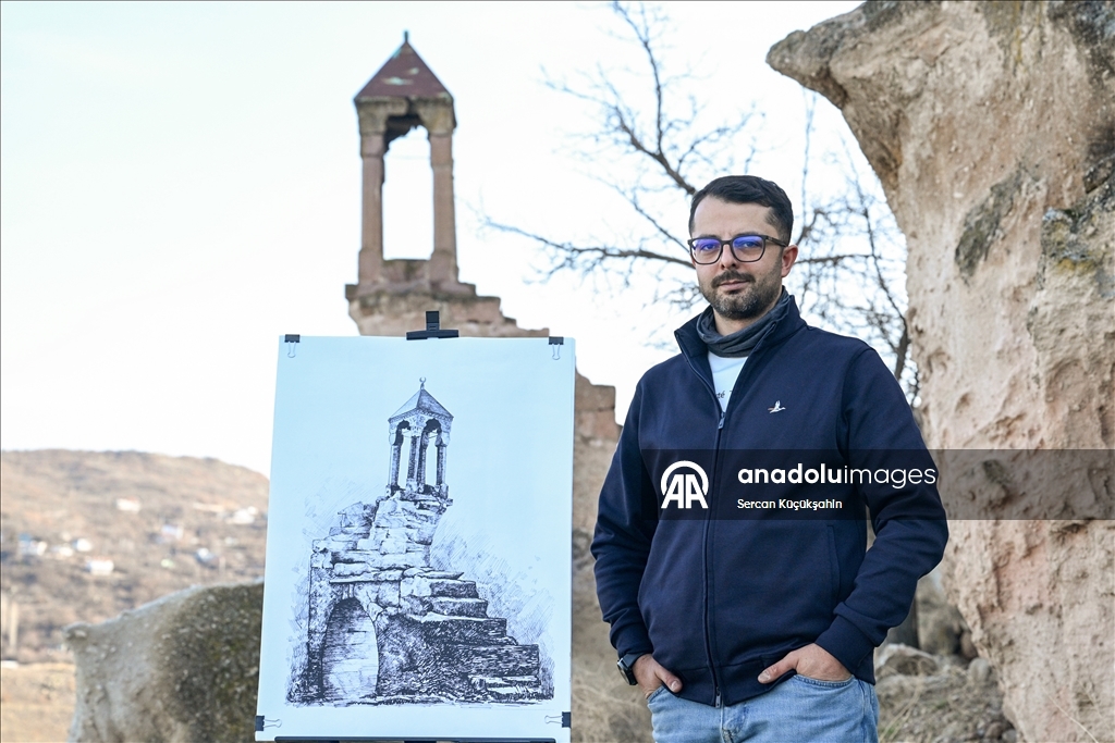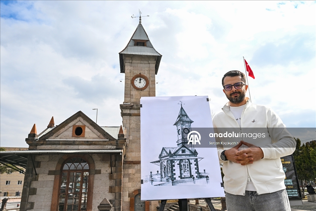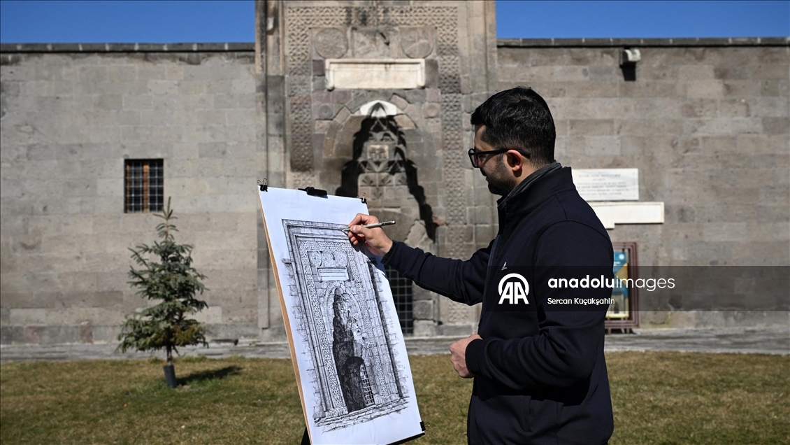 Kayseri'de ressam bir ailenin üçüncü kuşak temsilcisi 38 yaşındaki Muhammed Emin Gürpınar, kentteki tarihi eserleri çizimleriyle ölümsüzleştiriyor.