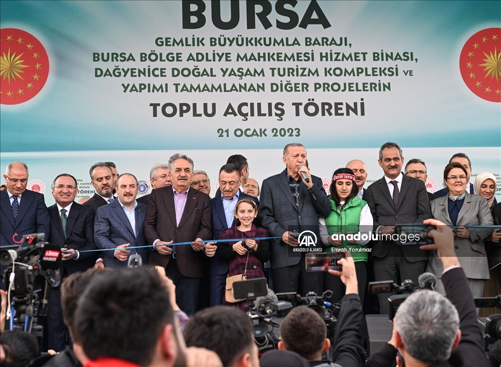 Cumhurbaşkanı Recep Tayyip Erdoğan, Bursa'da, Gemlik Büyükkumla Barajı, Bursa Bölge Adliye Mahkemesi Hizmet Binası, Dağyenice Doğal Yaşam Turizm Kompleksi ve Yapımı Tamamlanan Diğer Projelerin Toplu Açılış Töreni'ne katıldı. ( Emrah Yorulmaz - Anadolu Ajansı )Emrah Yorulmaz