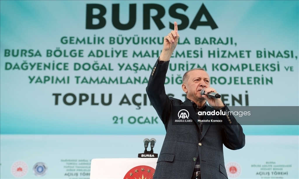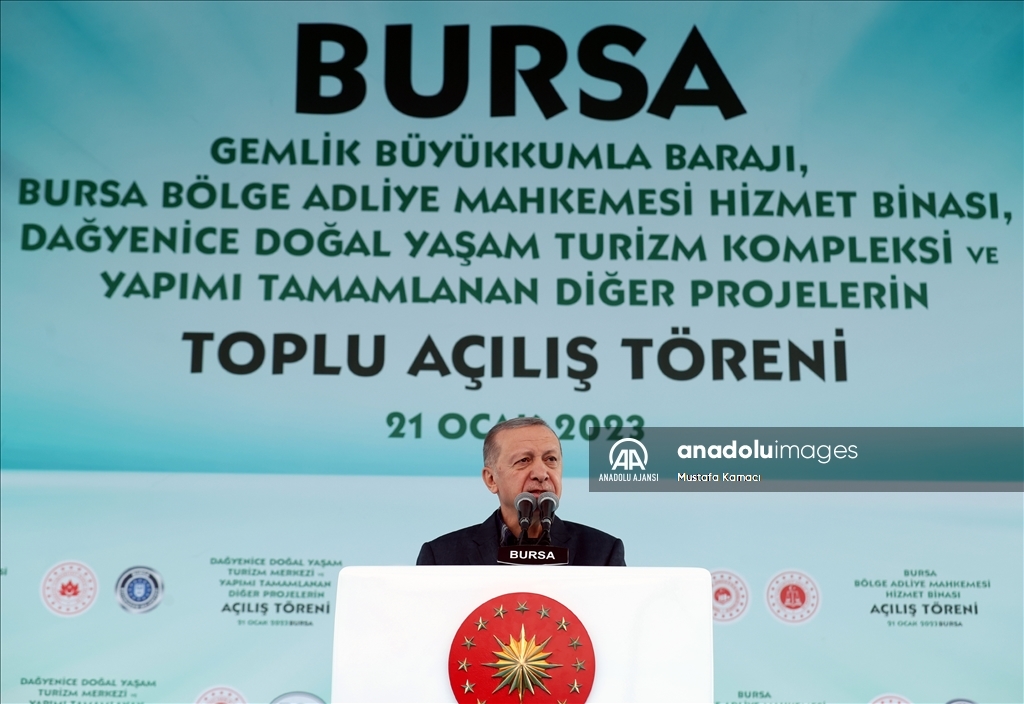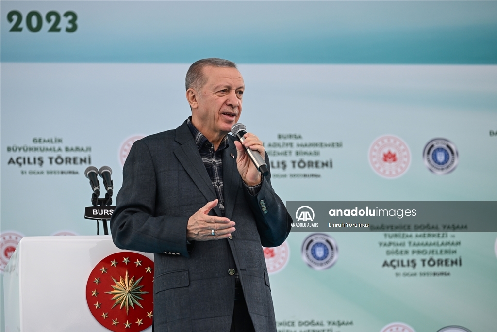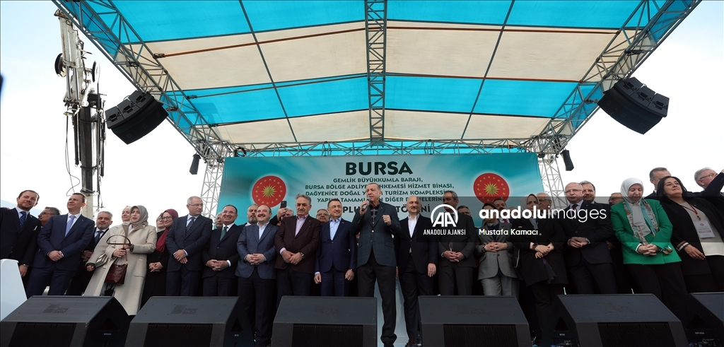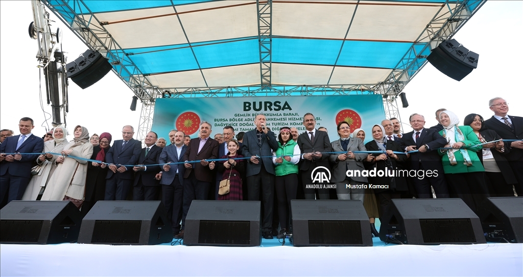 Cumhurbaşkanı Recep Tayyip Erdoğan, Bursa'da, Gemlik Büyükkumla Barajı, Bursa Bölge Adliye Mahkemesi Hizmet Binası, Dağyenice Doğal Yaşam Turizm Kompleksi ve Yapımı Tamamlanan Diğer Projelerin Toplu Açılış Töreni'ne katıldı. ( TCCB / Murat Çetinmühürdar - Anadolu Ajansı )TCCB / Murat Çetinmühürdar