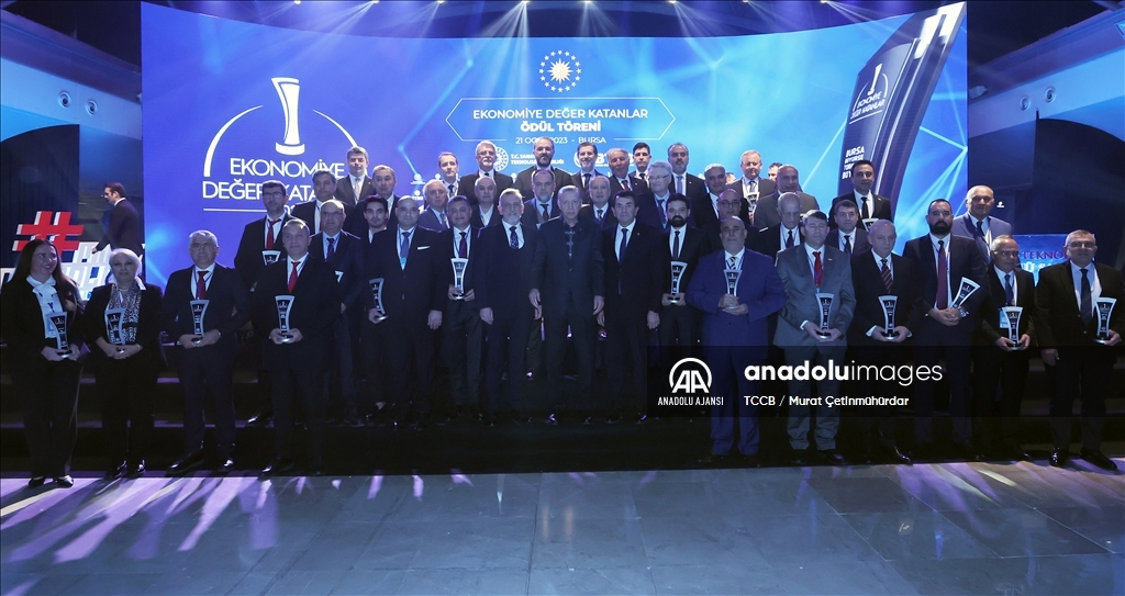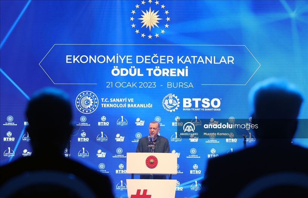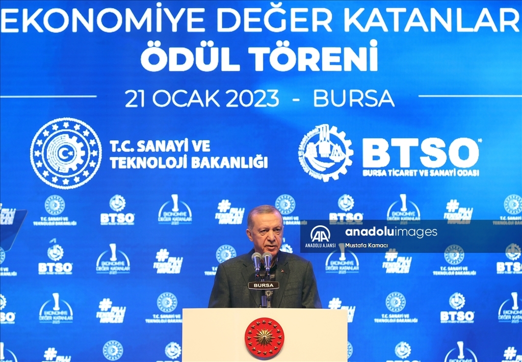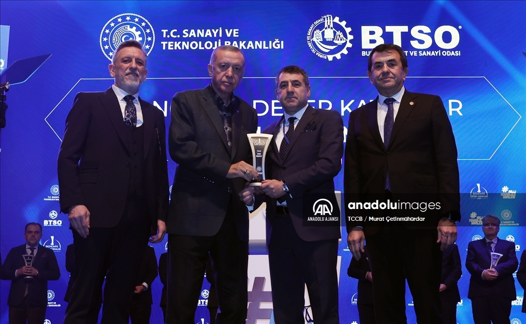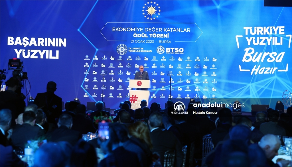 Cumhurbaşkanı Recep Tayyip Erdoğan, Merinos Atatürk Kongre ve Kültür Merkezi'nde düzenlenen Bursa Ticaret ve Sanayi Odası (BTSO) Ekonomiye Değer Katanlar Ödül Töreni'ne katıldı. ( TCCB / Murat Çetinmühürdar - Anadolu Ajansı )TCCB / Murat Çetinmühürdar