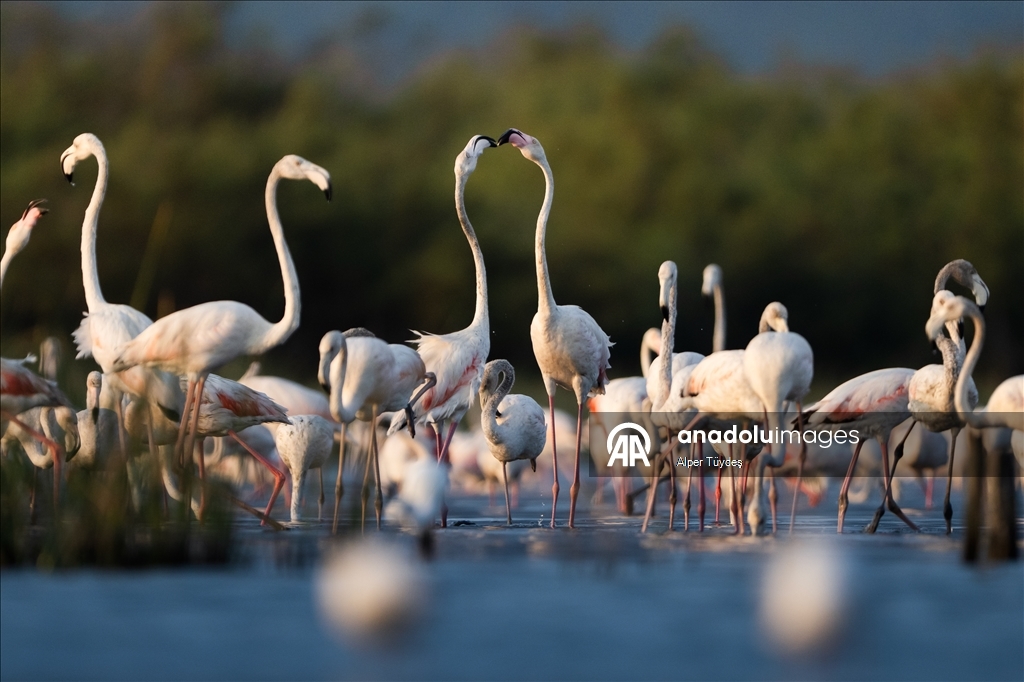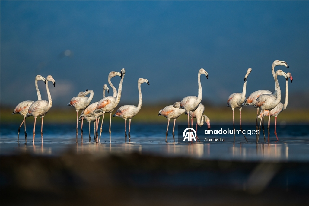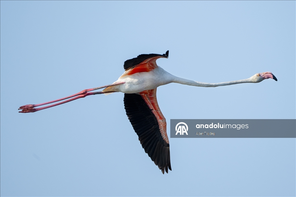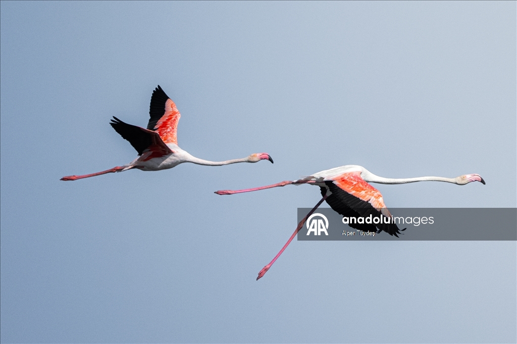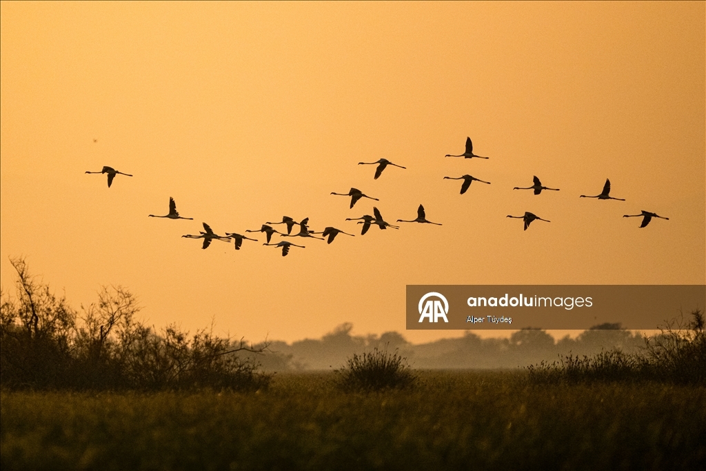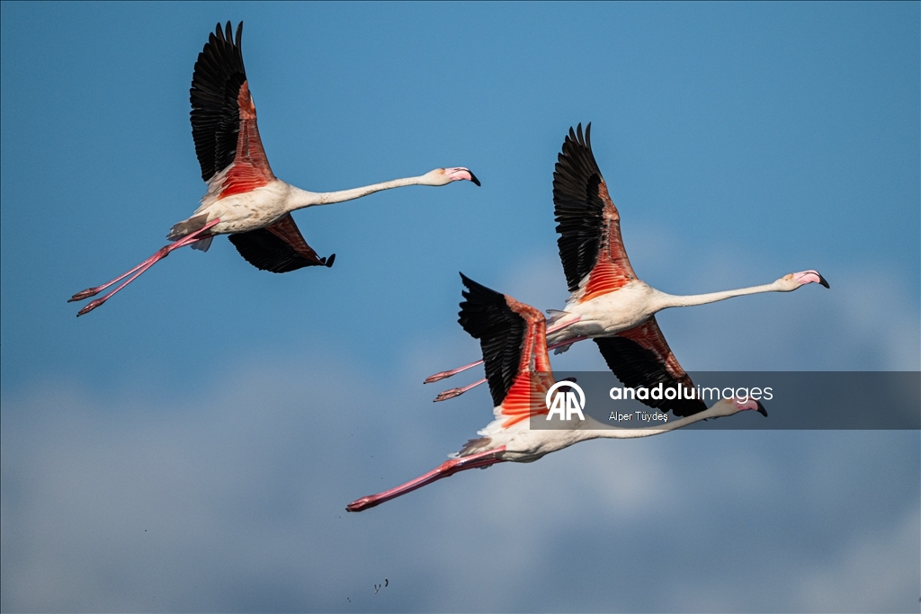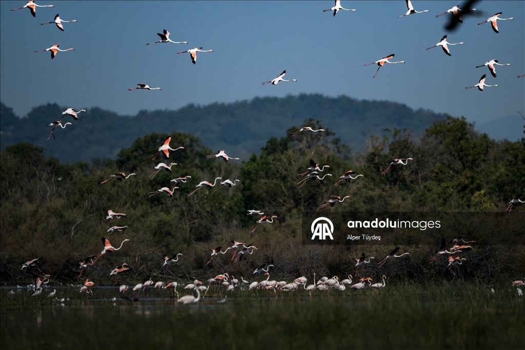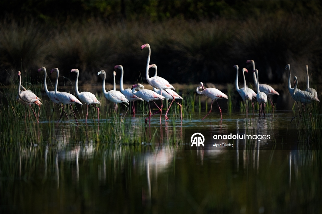 Her yıl kışlamak için deltaya gelen flamingolar, bataklık alanlarda beslenerek göç yolculuklarına burada devam ediyor. ( Alper Tüydeş - Anadolu Ajansı )
