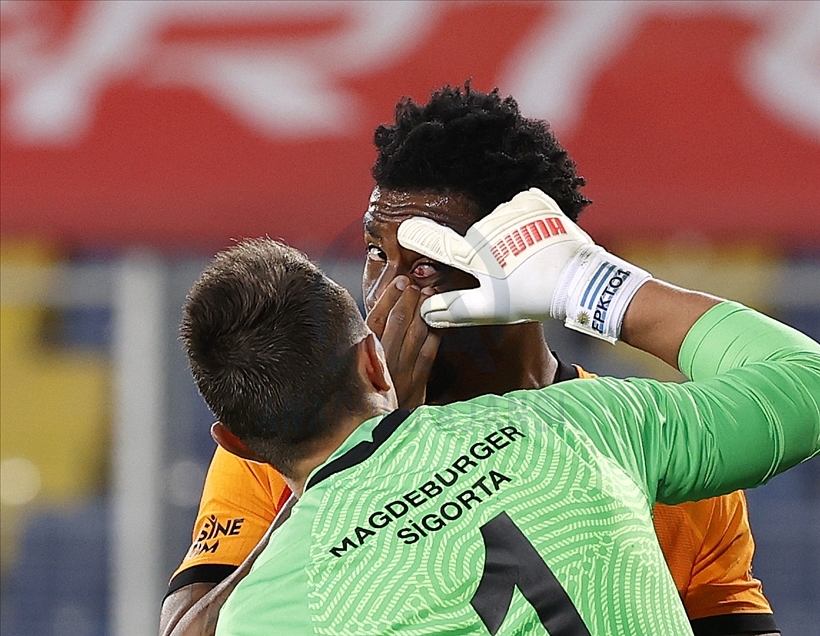 Süper Lig'de Gençlerbirliği ile Galatasaray takımları Ankara Eryaman Stadı'nda karşılaştı. Karşılaşma esnasında gözüne sinek kaçan Galatasaray oyuncusu Ryan Donk'a ilk müdahaleyi takım arkadaşı Fernando Muslera yaptı. ( Mehmet Ali Özcan - Anadolu Ajansı )Mehmet Ali Özcan