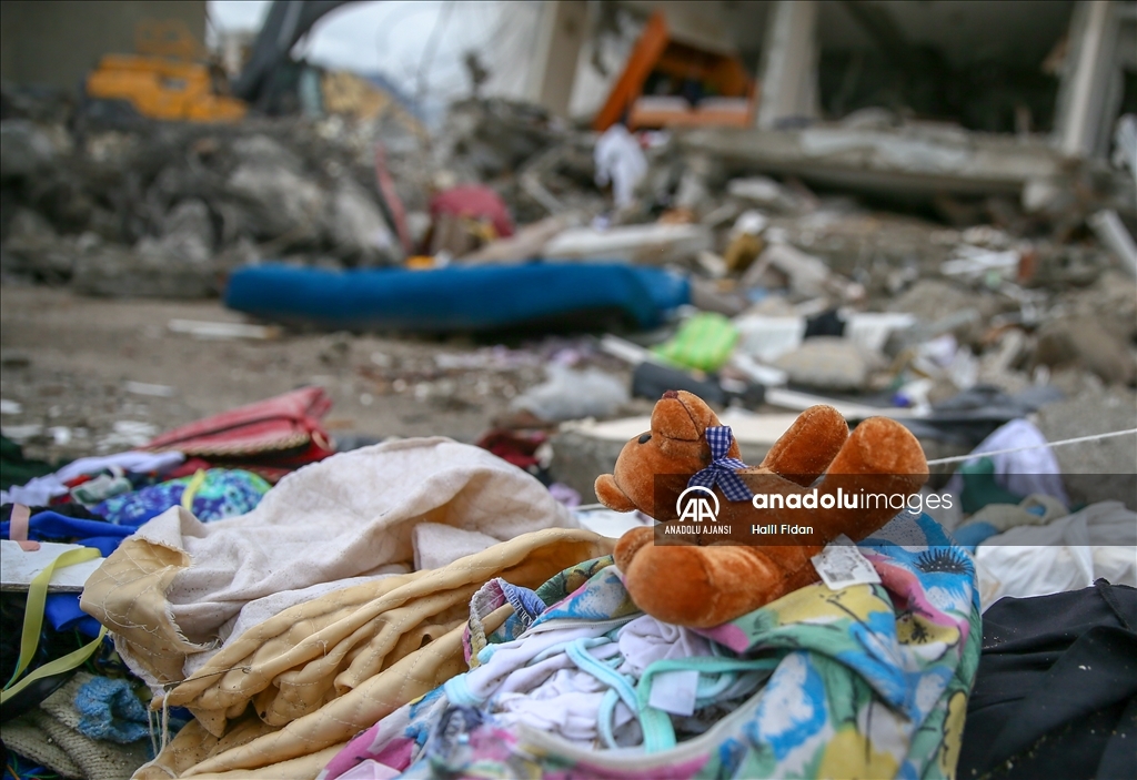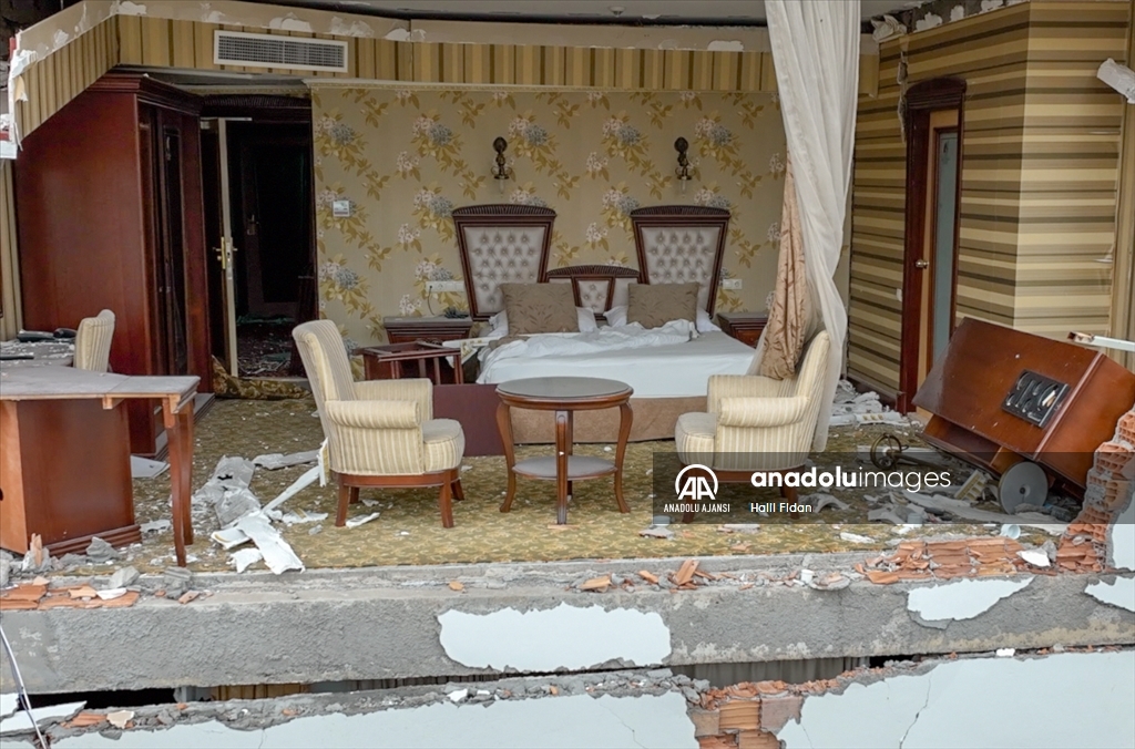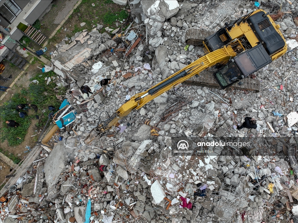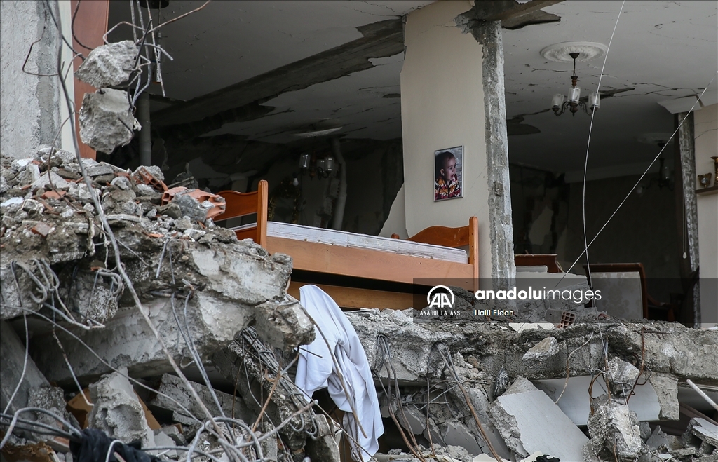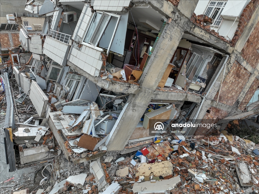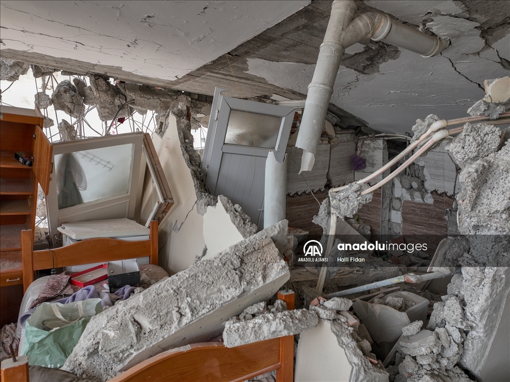 Kahramanmaraş merkezli 6 Şubat'taki depremlerden etkilenen Hatay'ın İskenderun ilçesinde ağır hasarlı binalardaki evler dronla görüntülendi. Kolon ve duvarları patlayan, zemine çöken veya yan yatan binalardaki evlerde depremin tahribatı dikkati çekiyor. ( Halil Fidan - Anadolu Ajansı )Halil Fidan