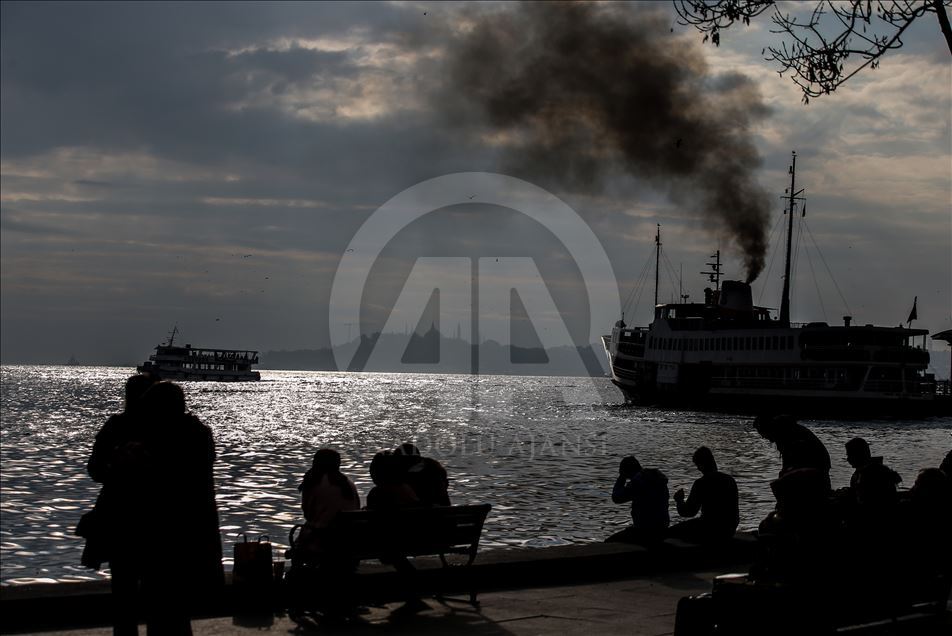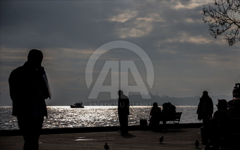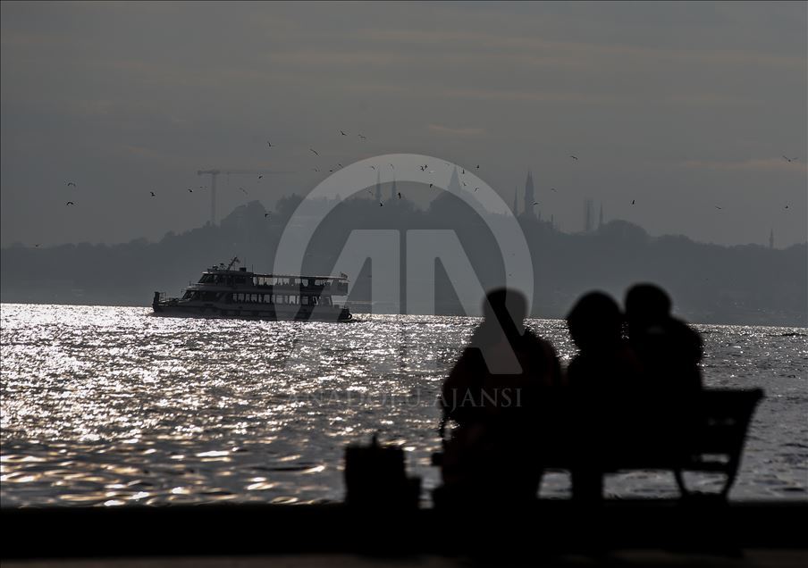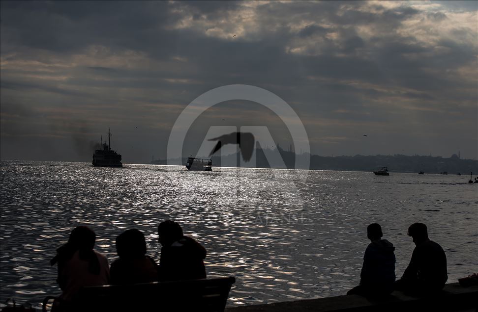 İstanbul'un gökyüzünü kaplayan bulutlardan süzülen güneş denize yansıdı. Bu sırada Beşiktaş sahilinde oturan vatandaşlar Tarihi Yarımada ve geçen vapurları seyretti. ( Emrah Yorulmaz - Anadolu Ajansı )Emrah Yorulmaz
