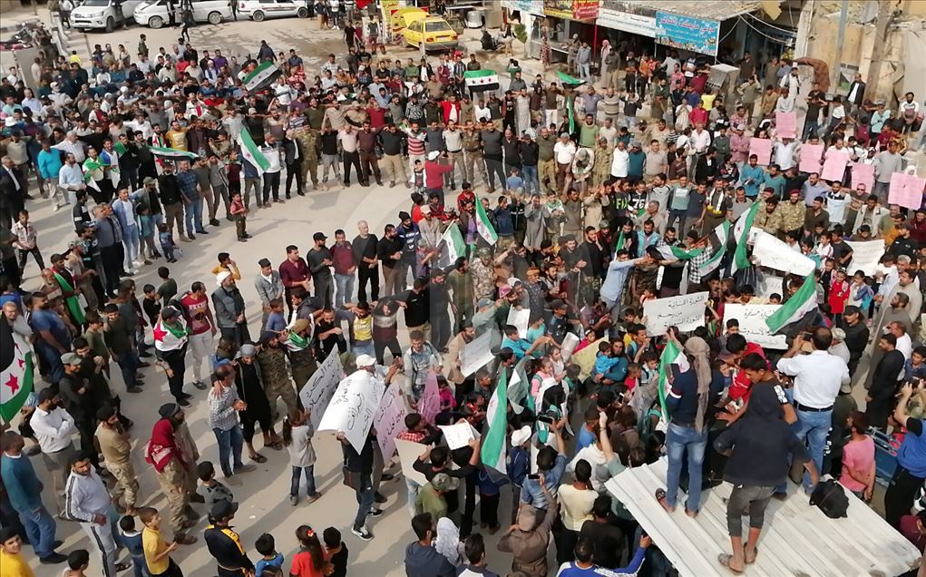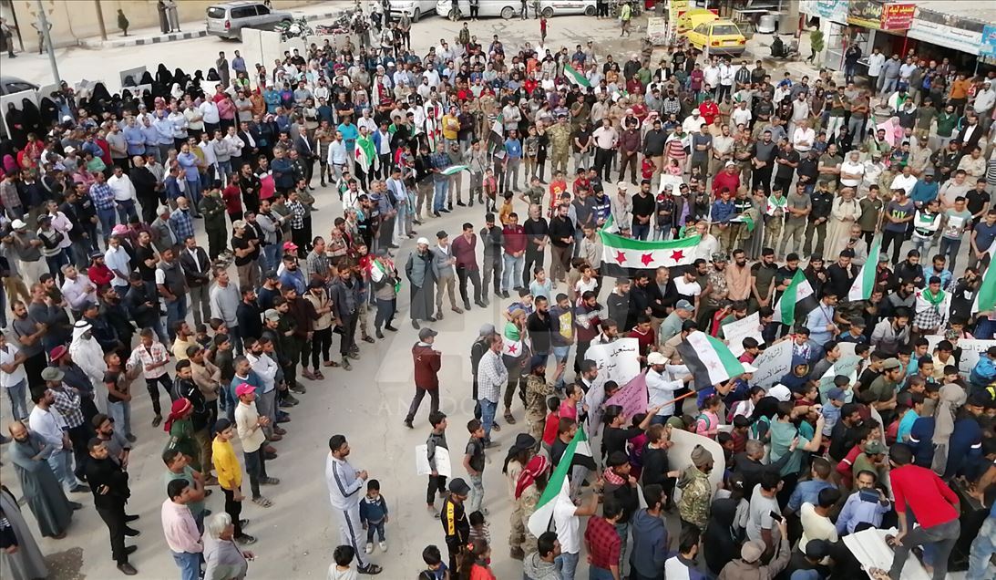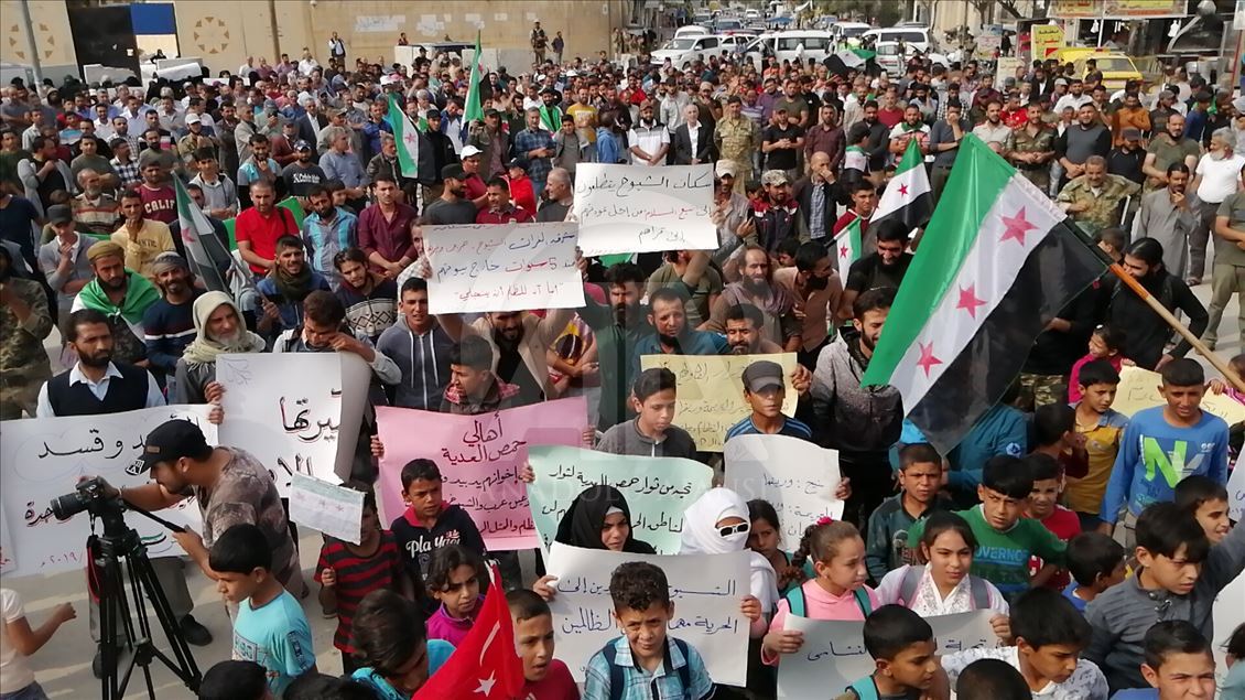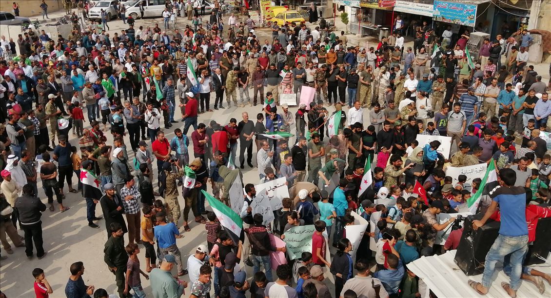 Fırat Kalkanı Harekatı bölgesinde yer alan Cerablus ilçesinde yaşayan yerinden edilmiş Münbiçliler, Esed rejiminin Münbiç'e girişini protesto etti. Eylemciler, Arapça "Esed rejimi Münbiç'ten çıksın", "Esed ve SDG aynı para biriminin farklı yüzleridir" ve "devrim devam ediyor" yazlı dövizler taşıdı. Suriye ayaklanmalarının sembolü Özgür Suriye bayrağını taşıyan eylemciler, Barış Pınarı Harekatı'na destek sloganı attı.