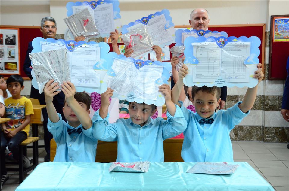 Yozgat'ta 75 bin 280 öğrenci karne alarak yaz tatiline girmenin sevincini yaşadı. Karnesini alan birinci sınıf öğrencileri karnelerini bir birine göstererek mutluluklarını paylaştı. ( Ömer Ertuğrul - Anadolu Ajansı )Ömer Ertuğrul