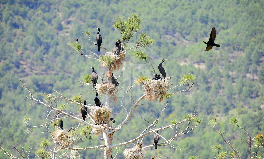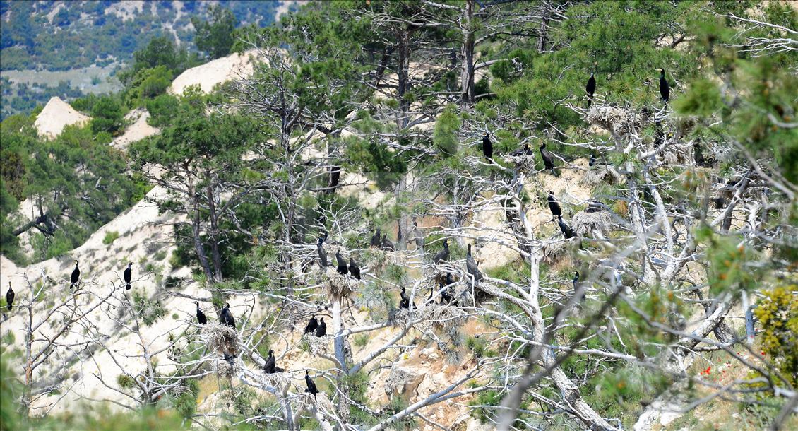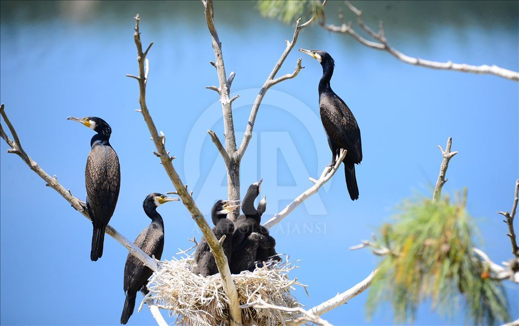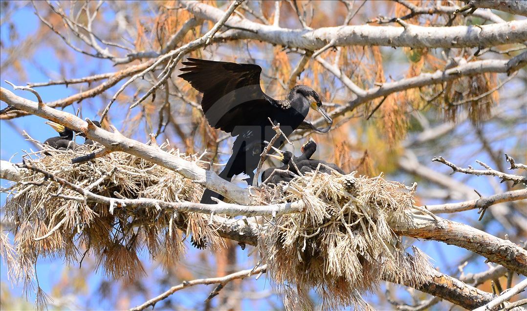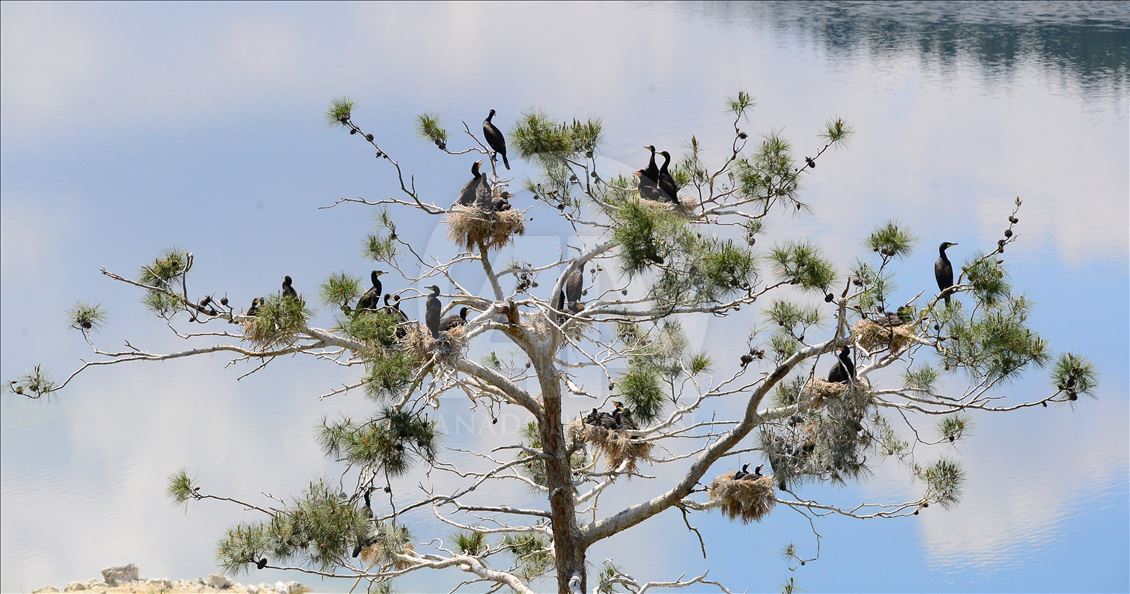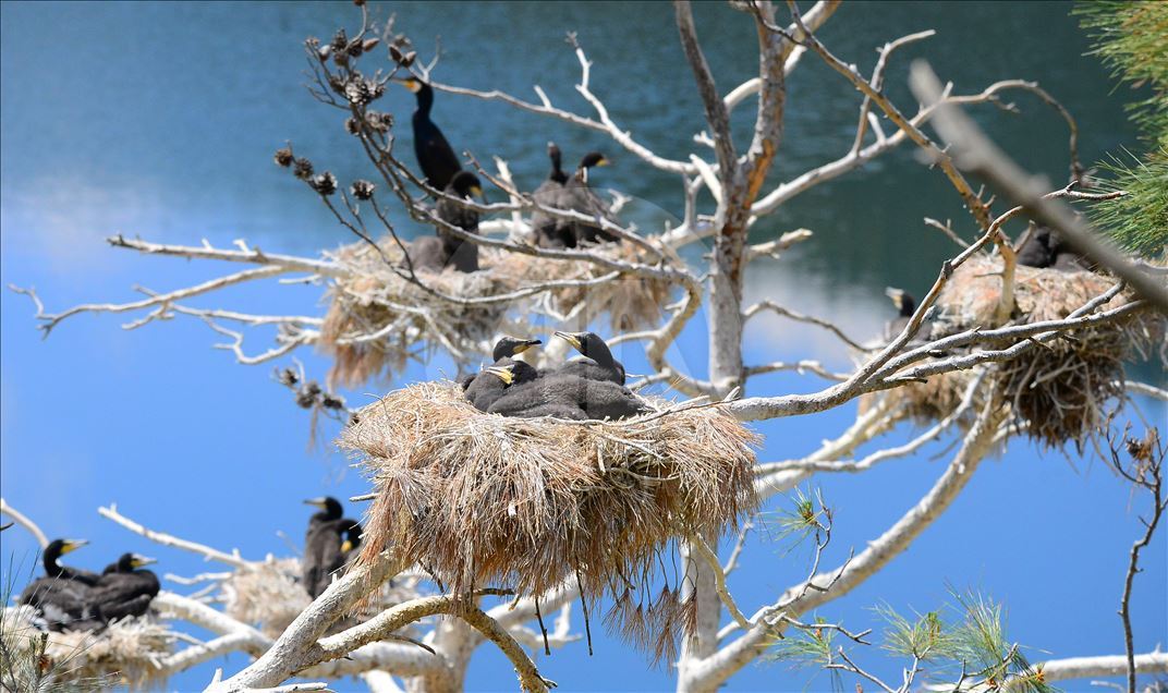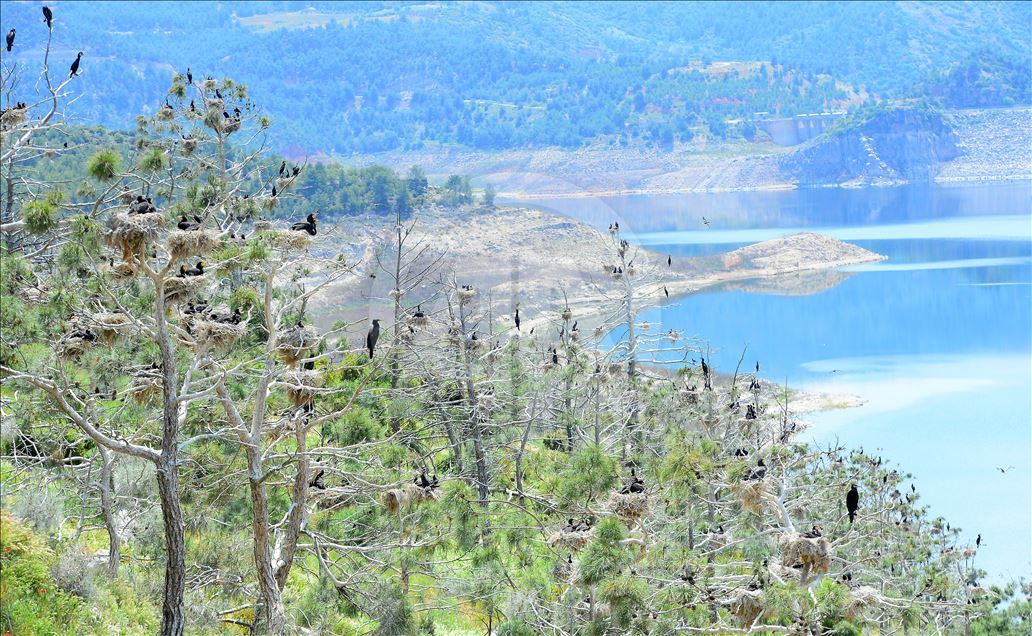 Uşak'ın Ulubey ilçesindeki Adıgüzeller Barajı su havzasında gri balıkçıl ve karabatak üreme noktasında sürdürülen etkin koruma yöntemleriyle bu yıl rekor kuş sayısına ulaşıldı.