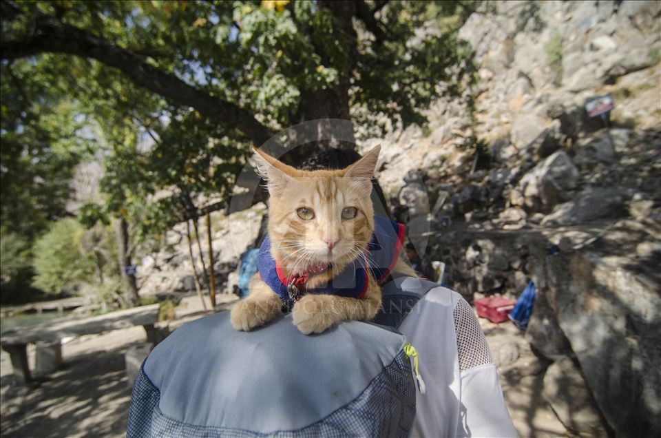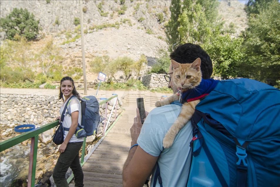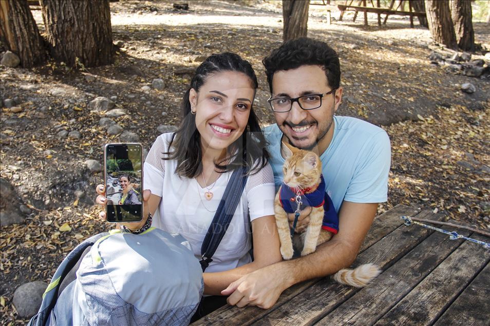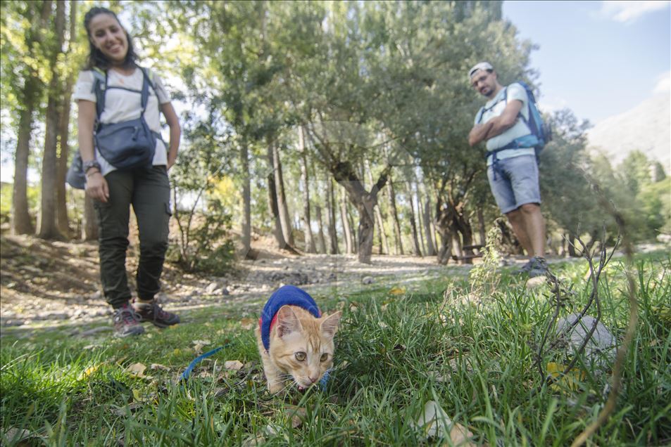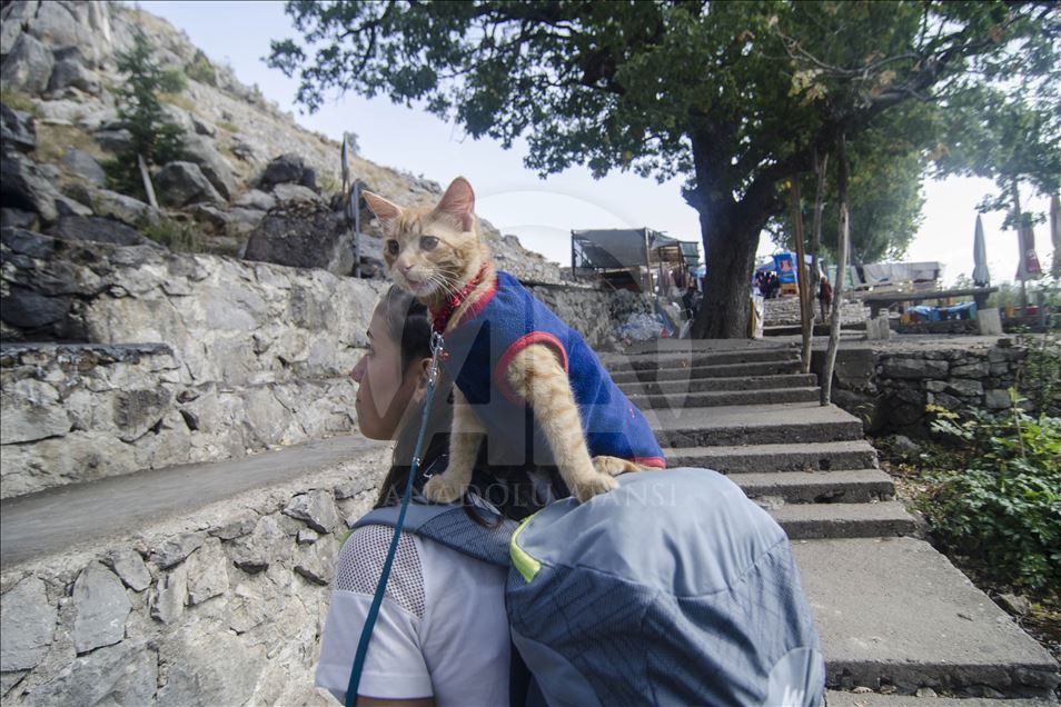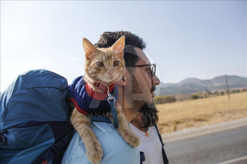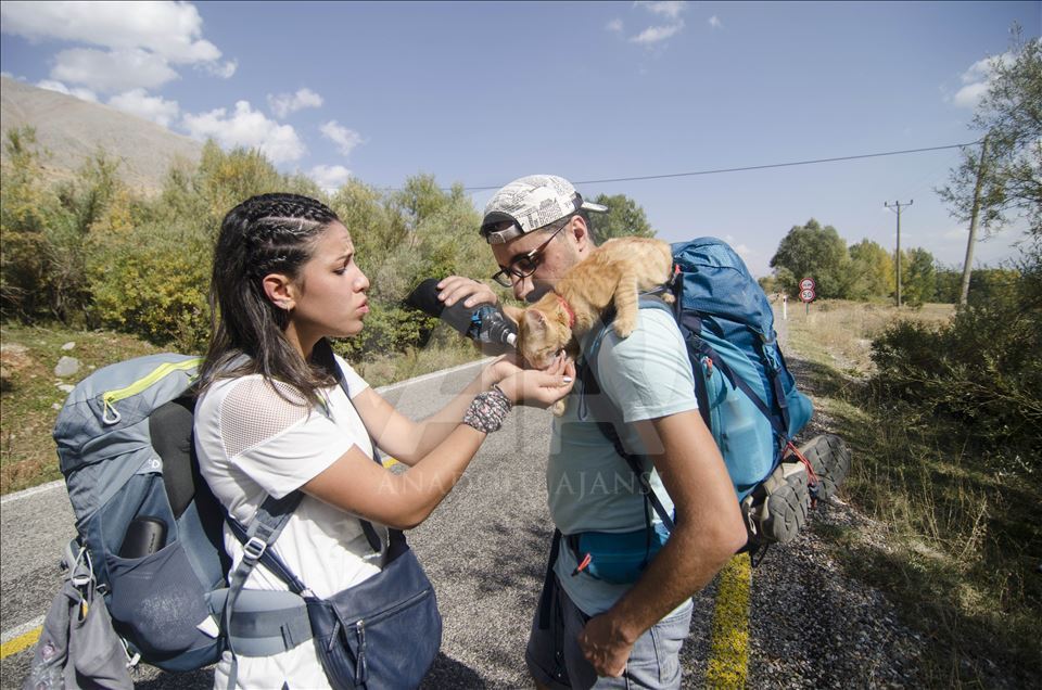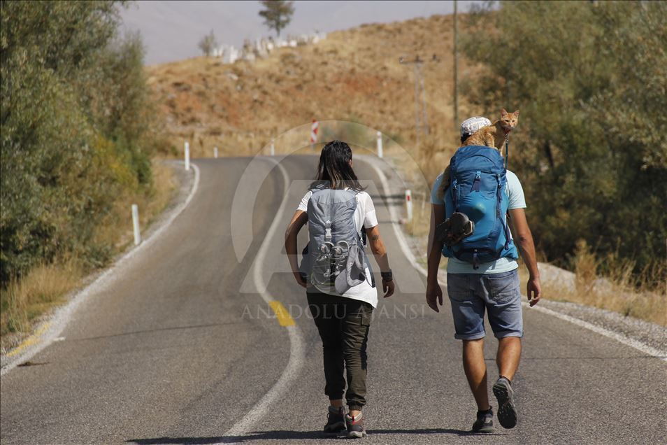 Artvin'de yaşayan doğa tutkunu Hamza Mutlu ve Özge Kübra Mace, yavruyken sokakta bulup büyüttükleri "Azman" isimli kediyle beraber Türkiye'nin tarihi, kültürel ve doğal güzelliklerini otostopla geziyor. ( Sidar Can Eren - Anadolu Ajansı )Sidar Can Eren