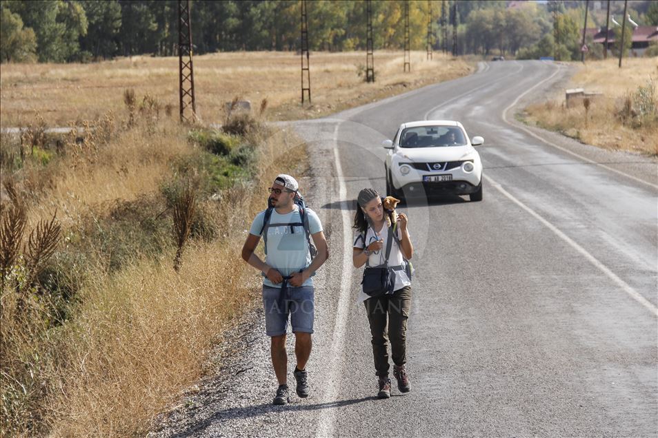 Artvin'de yaşayan doğa tutkunu Hamza Mutlu ve Özge Kübra Mace, yavruyken sokakta bulup büyüttükleri "Azman" isimli kediyle beraber Türkiye'nin tarihi, kültürel ve doğal güzelliklerini otostopla geziyor.