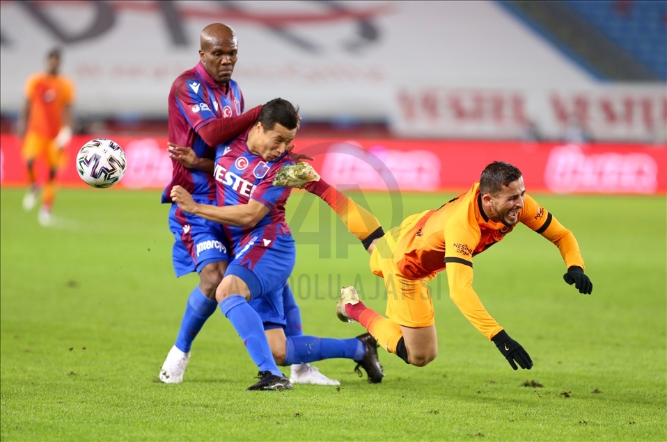 Süper Lig’in 15. haftasında Trabzonspor ile Galatasaray karşılaştı. Bir pozisyonda, Galatasaraylı futbolcu Omar Elabdellaoui (ortada) rakipleri ile mücadele etti. ( Hakan Burak Altunöz - Anadolu Ajansı )Hakan Burak Altunöz