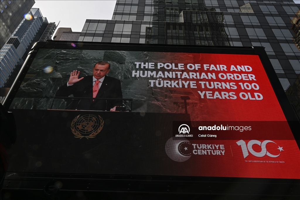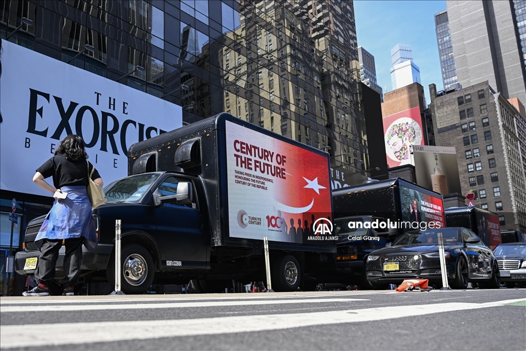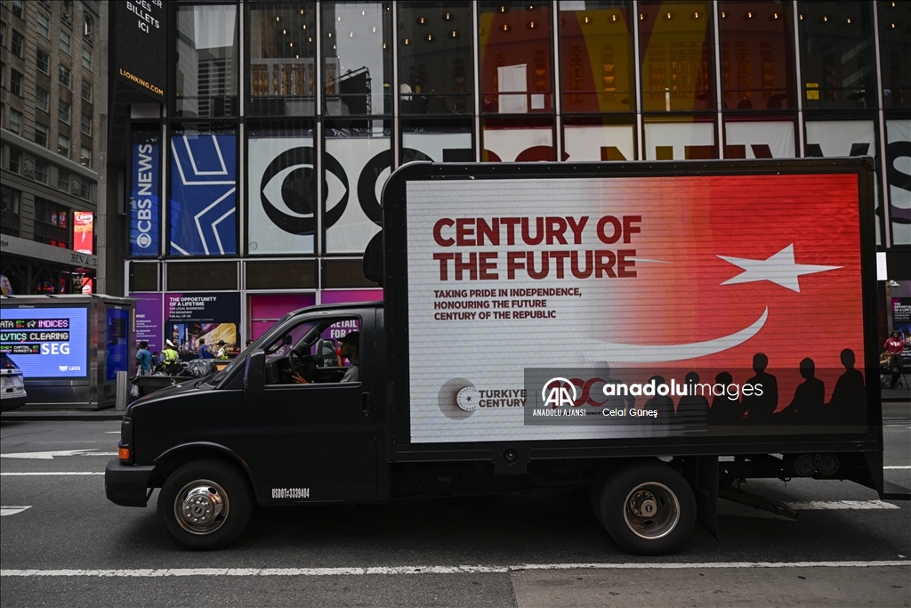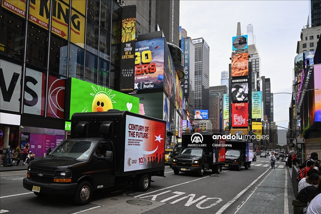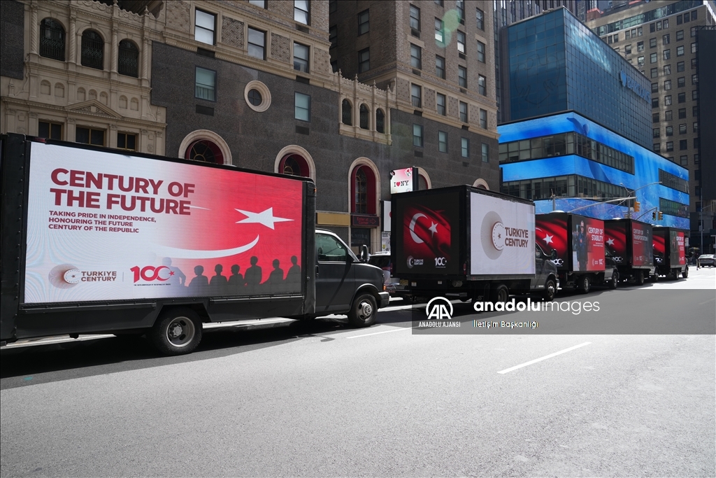 Cumhurbaşkanlığı İletişim Başkanlığı koordinasyonunda yürütülen Cumhuriyetin Yüzüncü Yılı etkinlikleri kapsamında “Türkiye Yüzyılı” New York’ta tanıtıldı. Birleşmiş Milletler 78. Genel Kurulu’nun gerçekleştirildiği New York’un merkezindeki cadde ve sokaklar ile Times Meydanı'ndaki led ekranlarda Türkiye Yüzyılı ve Cumhuriyetin 100. Yılının tanıtımı yapıldı. Times Meydanındaki led ekranlarda “Türkiye Yüzyılı başlıyor” yazılı Türk bayraklı tanıtımlar gerçekleştirildi. Türkiye Yüzyılını anlatan dijital içeriklerin yer aldığı led ekranlı kamyonetler de New York’un kalabalık cadde ve sokaklarında dolaştırıldı. 100. Yıl marşıyla tanıtımların yapıldığı kamyonetlerin ekranlarında, Maziden Atiye, İstikbalden İstiklale sloganlarıyla Türkiye Yüzyılı’nın barışın, istikrarın, istikbalin ve haklının yüzyılı olduğu vurgulandı. Görsellerde Türkiye’nin savunma, sanayi, teknoloji ve ulaştırma gibi alanlarda gerçekleştirildiği atılımlara da yer verildi. ( Celal Güneş - Anadolu Ajansı )Celal Güneş