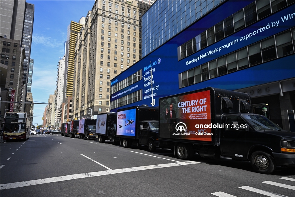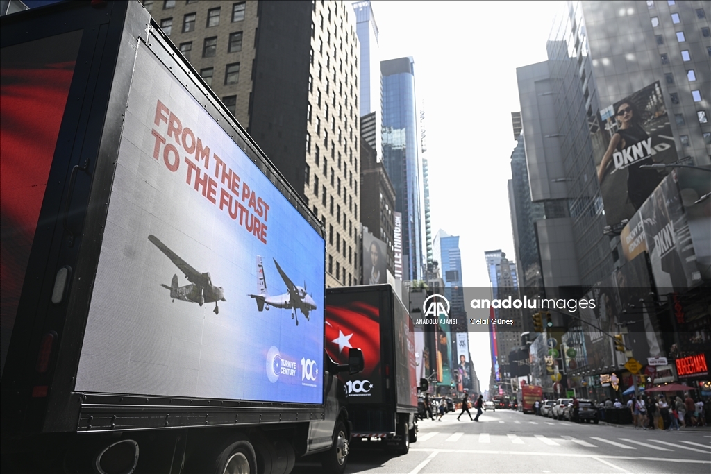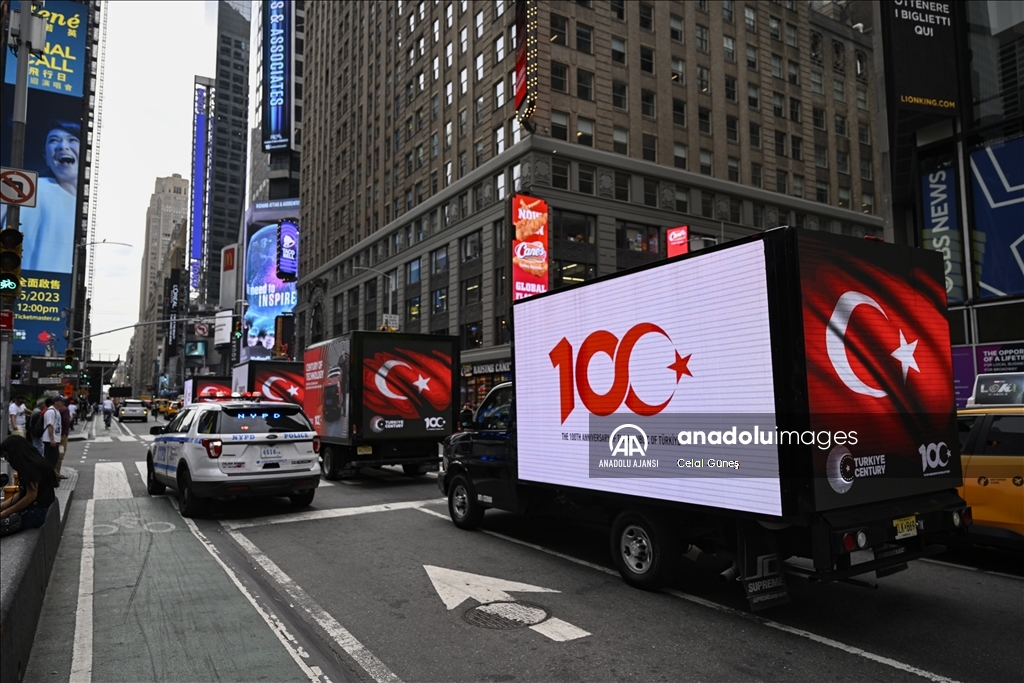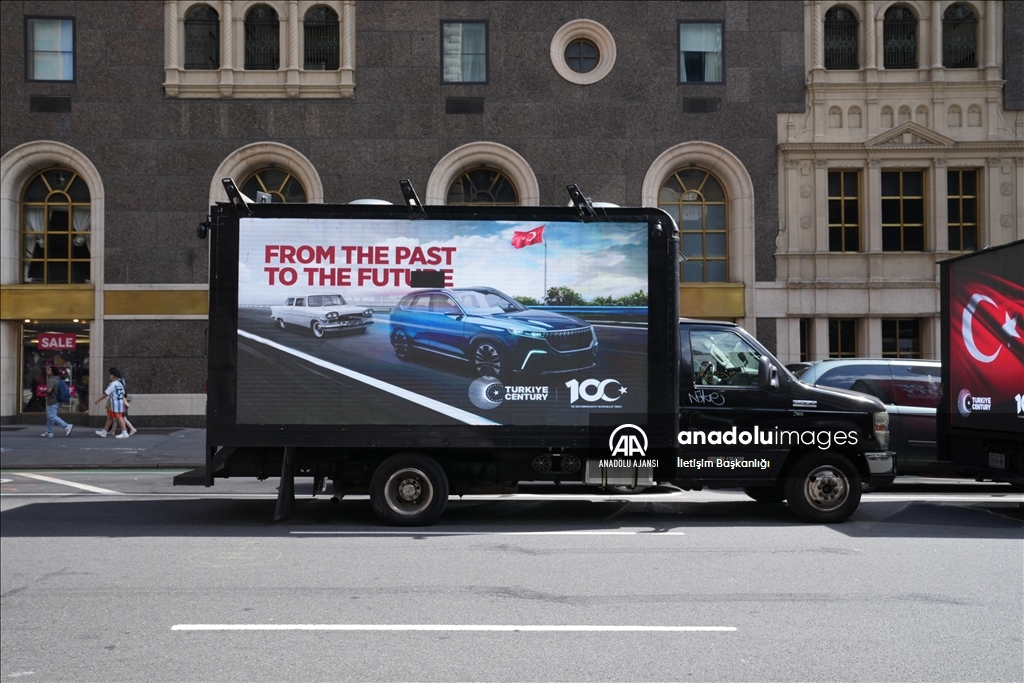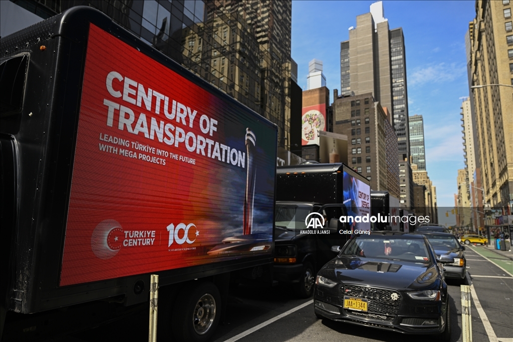 Cumhurbaşkanlığı İletişim Başkanlığı koordinasyonunda yürütülen Cumhuriyetin Yüzüncü Yılı etkinlikleri kapsamında “Türkiye Yüzyılı” New York’ta tanıtıldı. Birleşmiş Milletler 78. Genel Kurulu’nun gerçekleştirildiği New York’un merkezindeki cadde ve sokaklar ile Times Meydanı'ndaki led ekranlarda Türkiye Yüzyılı ve Cumhuriyetin 100. Yılının tanıtımı yapıldı. Times Meydanındaki led ekranlarda “Türkiye Yüzyılı başlıyor” yazılı Türk bayraklı tanıtımlar gerçekleştirildi. Türkiye Yüzyılını anlatan dijital içeriklerin yer aldığı led ekranlı kamyonetler de New York’un kalabalık cadde ve sokaklarında dolaştırıldı. 100. Yıl marşıyla tanıtımların yapıldığı kamyonetlerin ekranlarında, Maziden Atiye, İstikbalden İstiklale sloganlarıyla Türkiye Yüzyılı’nın barışın, istikrarın, istikbalin ve haklının yüzyılı olduğu vurgulandı. Görsellerde Türkiye’nin savunma, sanayi, teknoloji ve ulaştırma gibi alanlarda gerçekleştirildiği atılımlara da yer verildi. ( Celal Güneş - Anadolu Ajansı )Celal Güneş