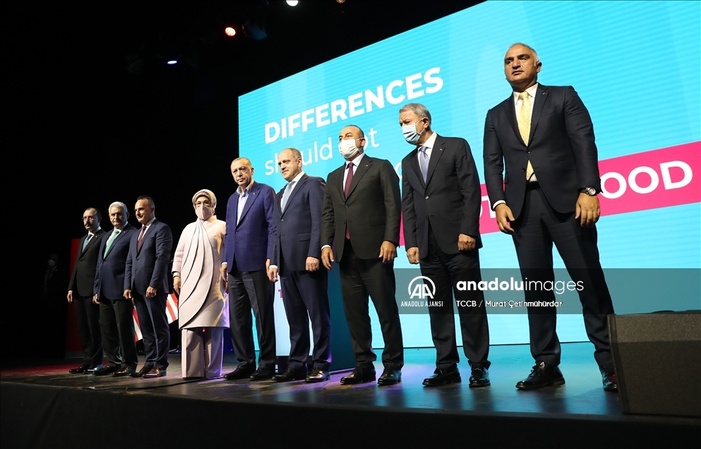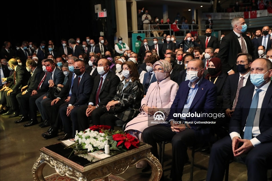 Cumhurbaşkanı Recep Tayyip Erdoğan, Türk-Amerikan Ulusal Yönlendirme Komitesince (TASC) The Manhattan Center'da düzenlenen "Daha Adil Bir Dünya Mümkün" başlıklı konferansa katıldı. Konferansa Cumhurbaşkanı Erdoğan'ın eşi Emine Erdoğan, Dışişleri Bakanı Mevlüt Çavuşoğlu, Milli Savunma Bakanı Hulusi Akar, Kültür ve Turizm Bakanı Mehmet Nuri Ersoy, Ticaret Bakanı Mehmet Muş ve AK Parti Genel Başkanvekili Binali Yıldırım da katıldı. ( TCCB / Murat Çetinmühürdar - Anadolu Ajansı )TCCB / Murat Çetinmühürdar
