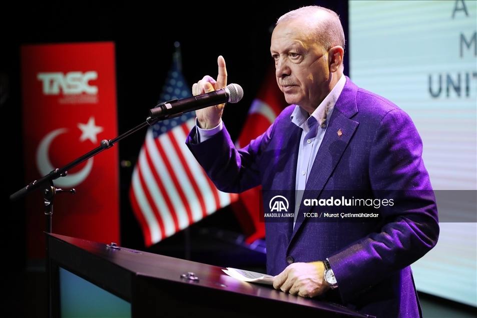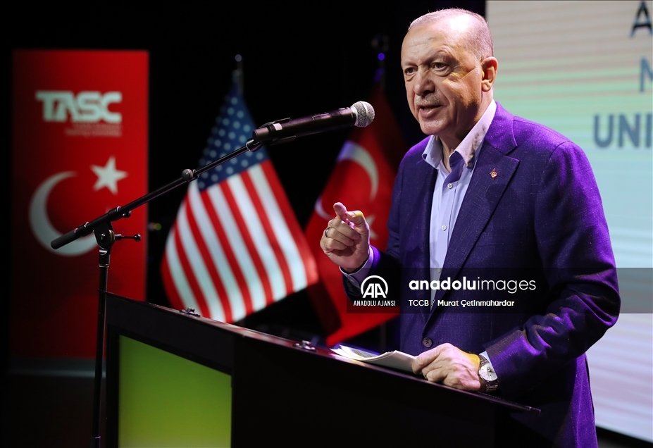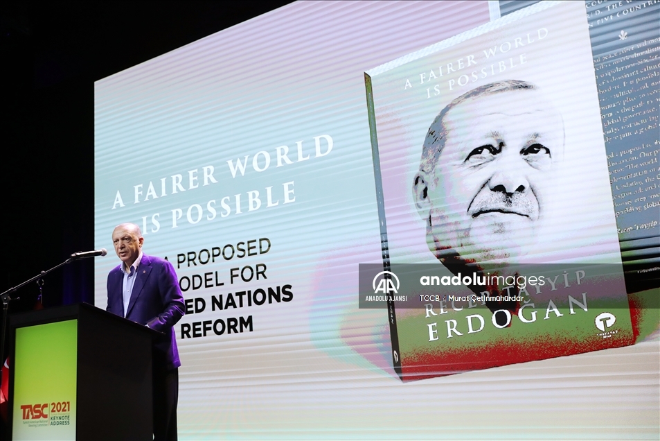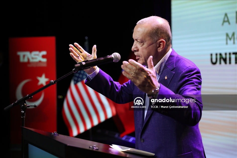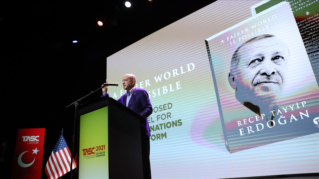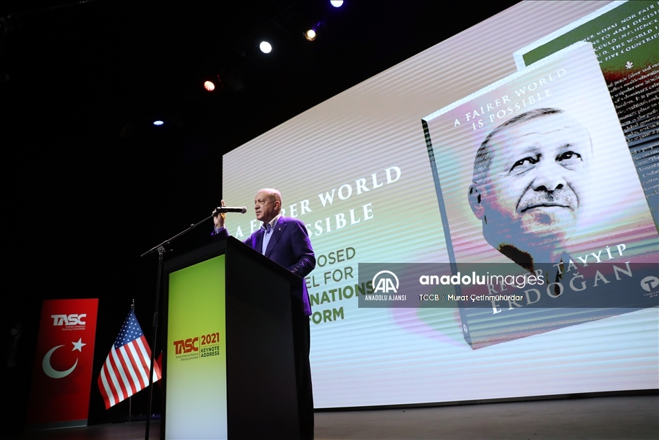 Cumhurbaşkanı Recep Tayyip Erdoğan, Türk-Amerikan Ulusal Yönlendirme Komitesince (TASC) düzenlenen "Daha Adil Bir Dünya Mümkün" başlıklı konferansa katılarak konuşma yaptı. ( TCCB / Murat Çetinmühürdar - Anadolu Ajansı )TCCB / Murat Çetinmühürdar