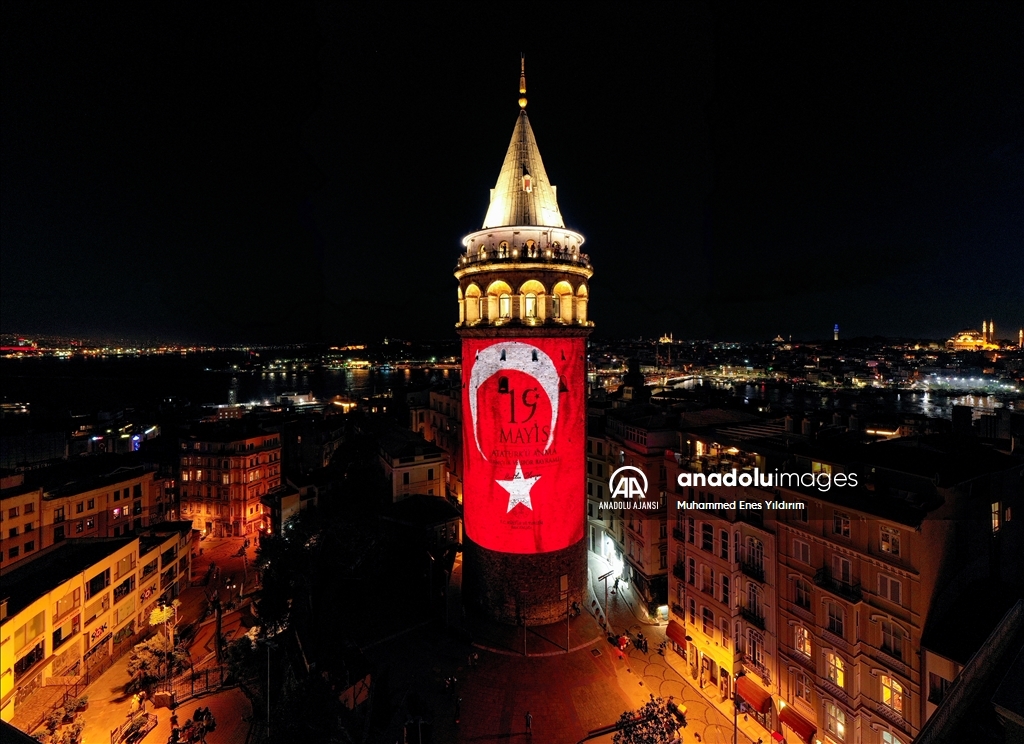 Birinci Dünya savaşından mağlup çıkan Osmanlı Devleti ile İtilaf Devletleri arasında 30 Ekim 1918'de imzalanan Mondros Mütarekesinin ardından düşman gemileri Çanakkale Boğazı'ndan geçerek İstanbul'a demirledi. Anadolu, düşman kuvvetleri tarafından adım adım işgal edilmeye başladı. İstanbul hükümeti, Anadolu'da asayişi sağlamak üzere Mustafa Kemal Paşa'yı 9. Ordu Müfettişi olarak görevlendirdi. 16 Mayıs'ta Bandırma Vapuru ile İstanbul'dan Samsun'a hareket eden Mustafa Kemal Paşa, 19 Mayıs 1919'da Samsun'a ulaştı. Büyük önderin Samsun'a çıkışı, Yunan askerlerinin denize döküldüğü 9 Eylül 1922'ye kadar sürecek büyük mücadelenin ilk adımını oluşturdu. Kurtuluş Savaşı'nın başlangıç tarihi olarak kabul edilen ve Türk milleti için dönüm noktalarından biri olan 19 Mayıs, her yıl tüm yurtta "Atatürk’ü Anma, Gençlik ve Spor Bayramı" olarak kutlanıyor. 9 Mayıs Atatürk'ü Anma, Gençlik ve Spor Bayramı kutlamalarında Galata Kulesi'ne Türk bayrağı ve tarihi olaylara ilişkin hazırlanan görseller yansıtıldı. (Arşiv-19.05.2021) ( Muhammed Enes Yıldırım - Anadolu Ajansı )