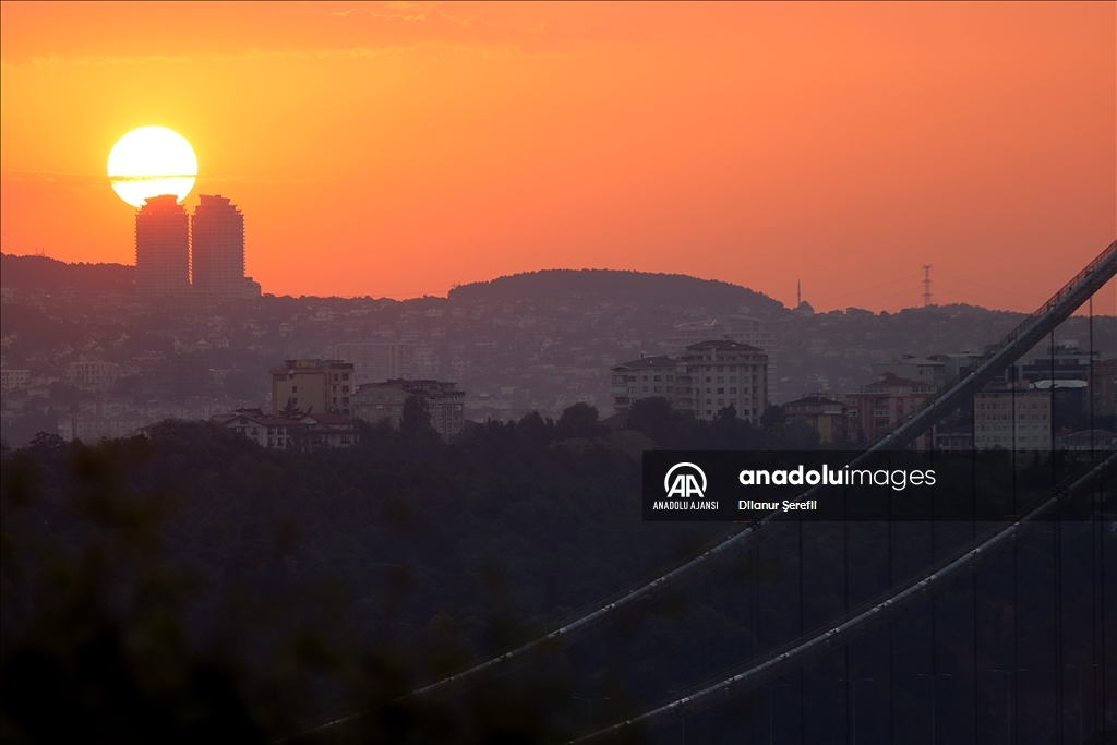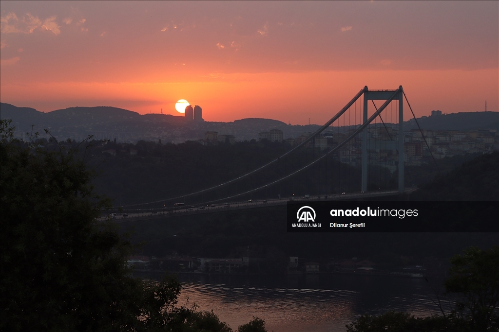 İstanbul'da gündoğumu Fatih Sultan Mehmet (FSM) Köprüsü ile birlikte Rumelihisarı'ndan görüntülendi. ( Dilanur Şerefli - Anadolu Ajansı )Dilanur Şerefli