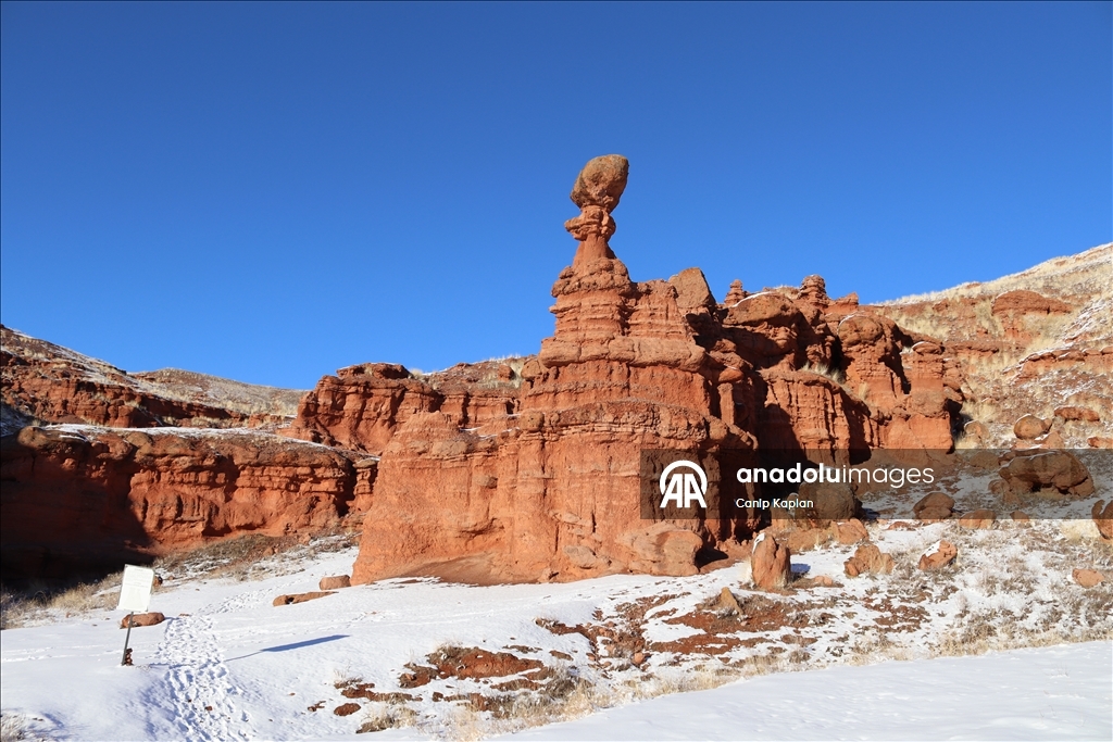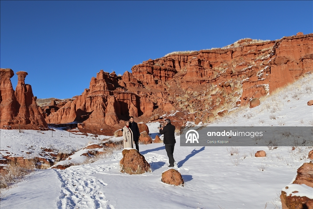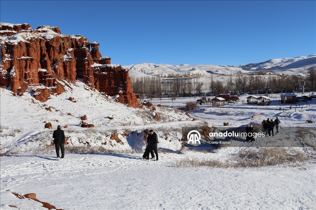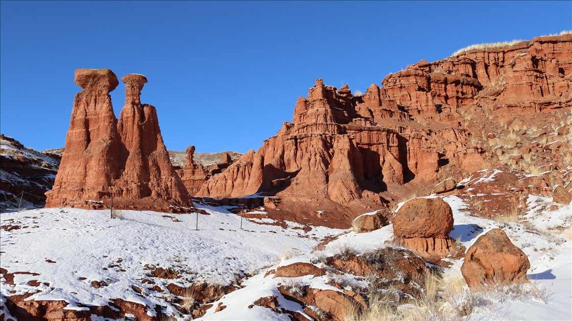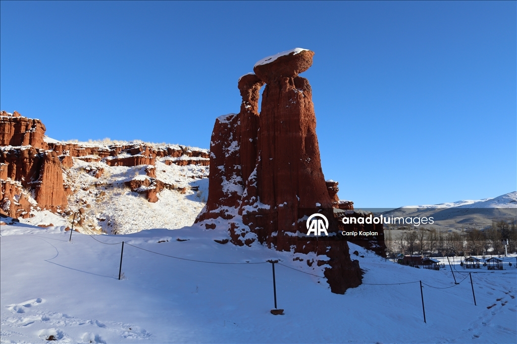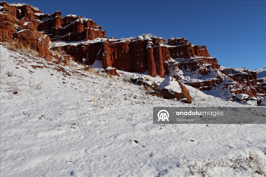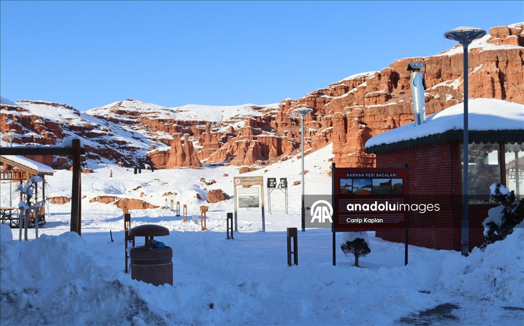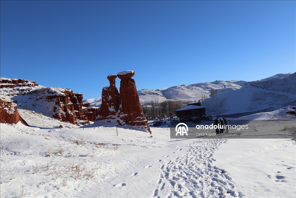 Erzurum'un Narman-Pasinler otoyolunun 7'nci kilometresinde yer alan ve halk arasında "Kırmızı periler diyarı" olarak da bilinen Narman Peri Bacaları'na mevsimin ilk karı yağdı.