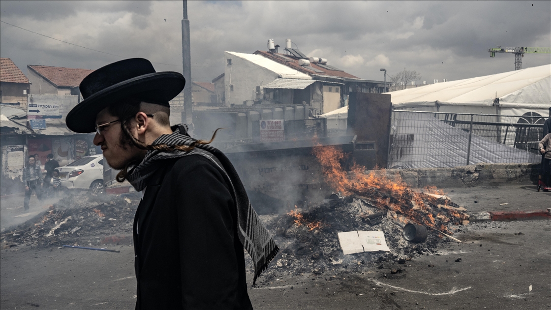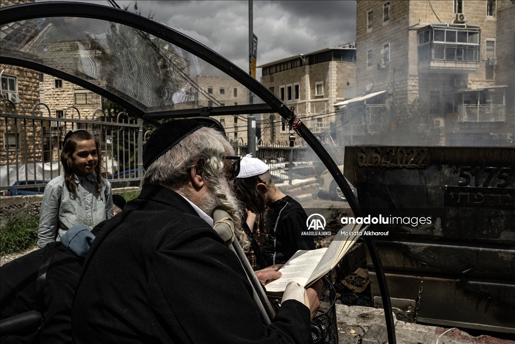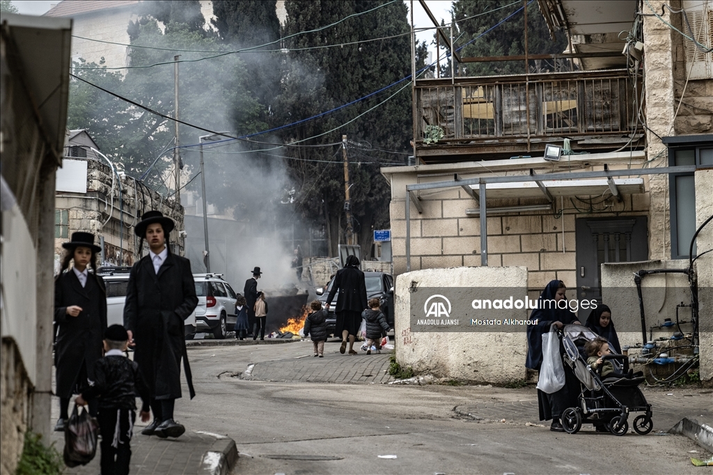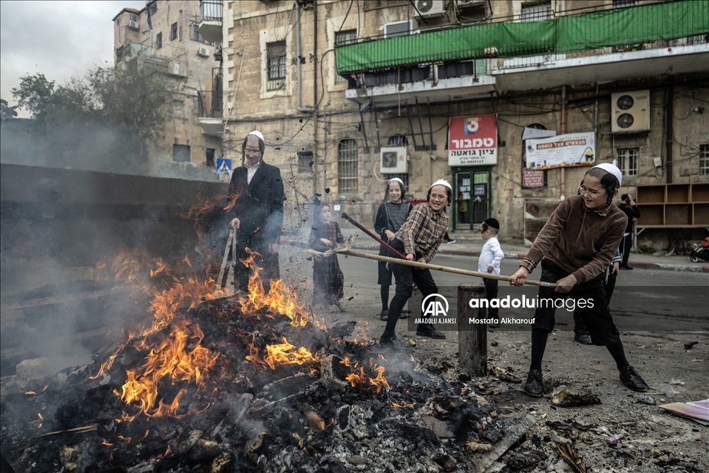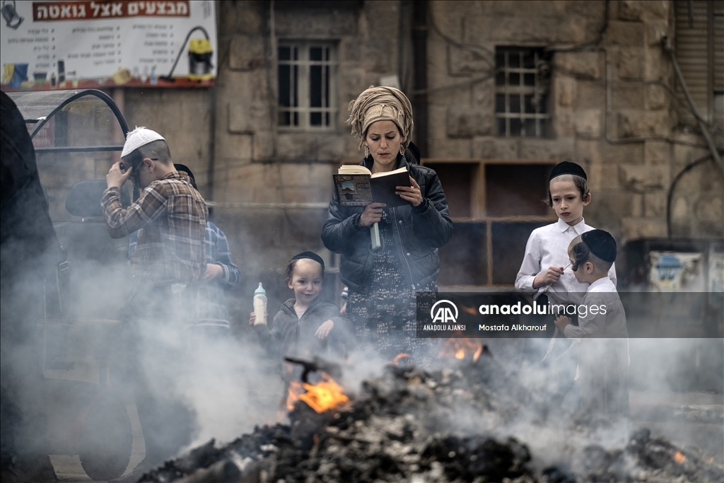 Hamursuz bayramın başlamasına günler kala Kudüs'ün Mea Shearim mahallesinde yaşayan Ultra Ortodoks Yahudiler (Harediler), ateşler yakılarak, mayalı hamurdan yapılan ekmek ve diğer gıda maddeleri imha etti. (Mostafa Alkharouf - Anadolu Ajansı)Mostafa Alkharouf