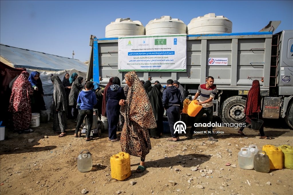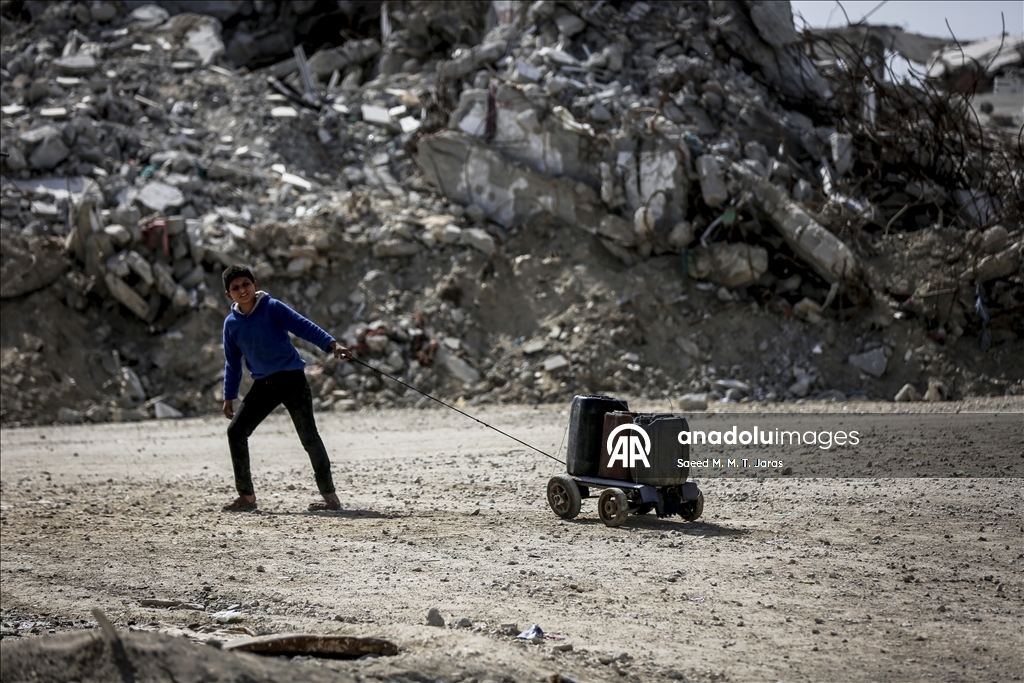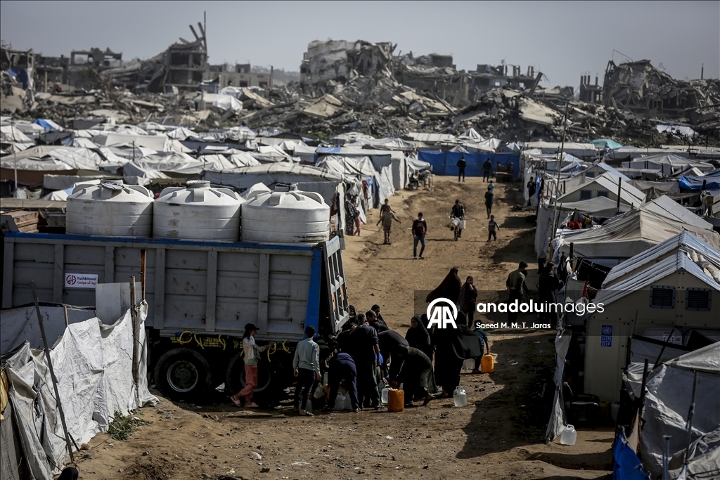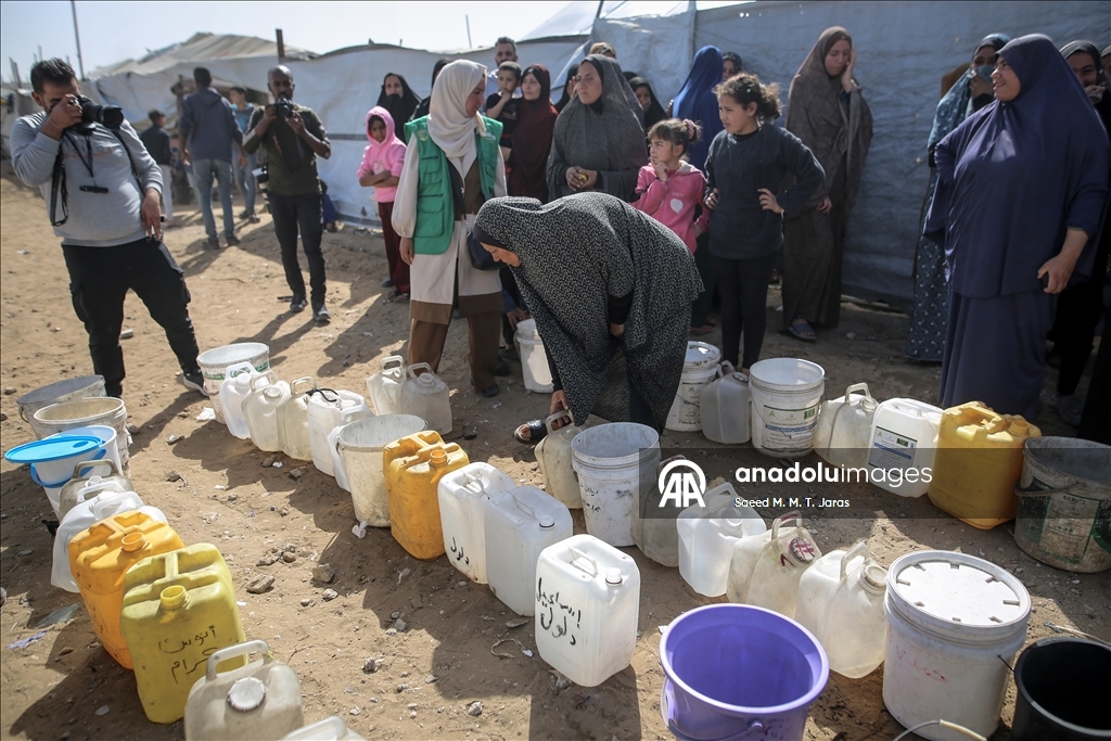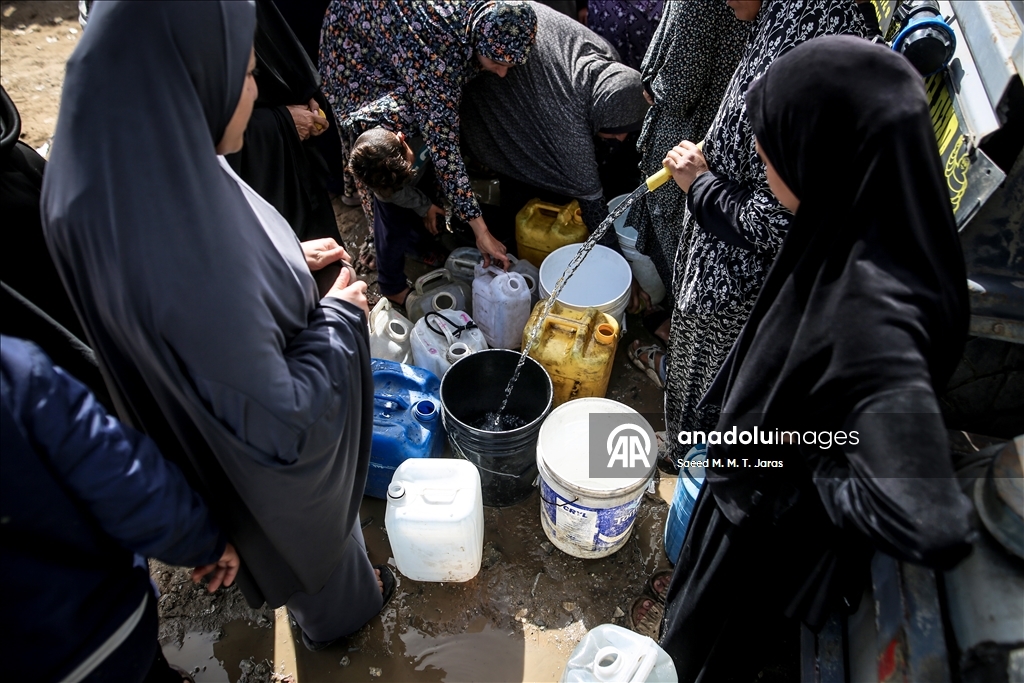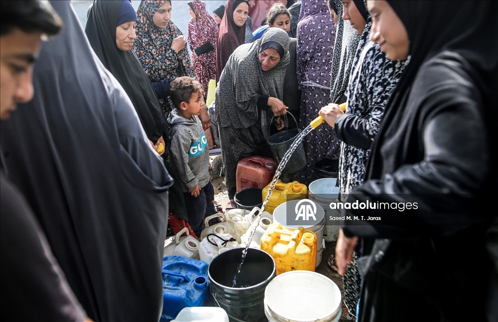 İsrail saldırıları sonucu altyapının ağır hasar görmesi sebebiyle su krizinin yaşandığı Gazze Şeridi'nin kuzeyindeki Gazze kentinde yaşayan Filistinliler, tankerlerin dağıttığı suları bidonlara doldurarak yaşam alanlarına taşıdı. ( Saeed M. M. T. Jaras - Anadolu Ajansı )