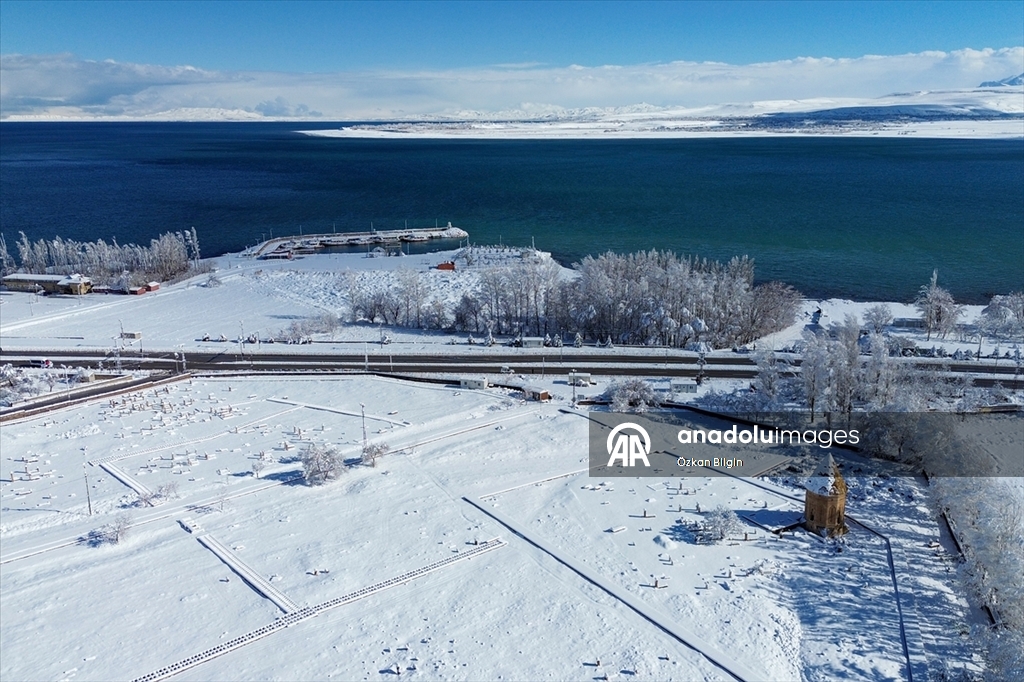 Van'da etkili olan kar yağışı sonrası Gevaş ilçesindeki Selçuklu Mezarlığı beyaza büründü