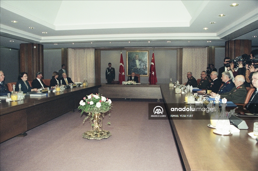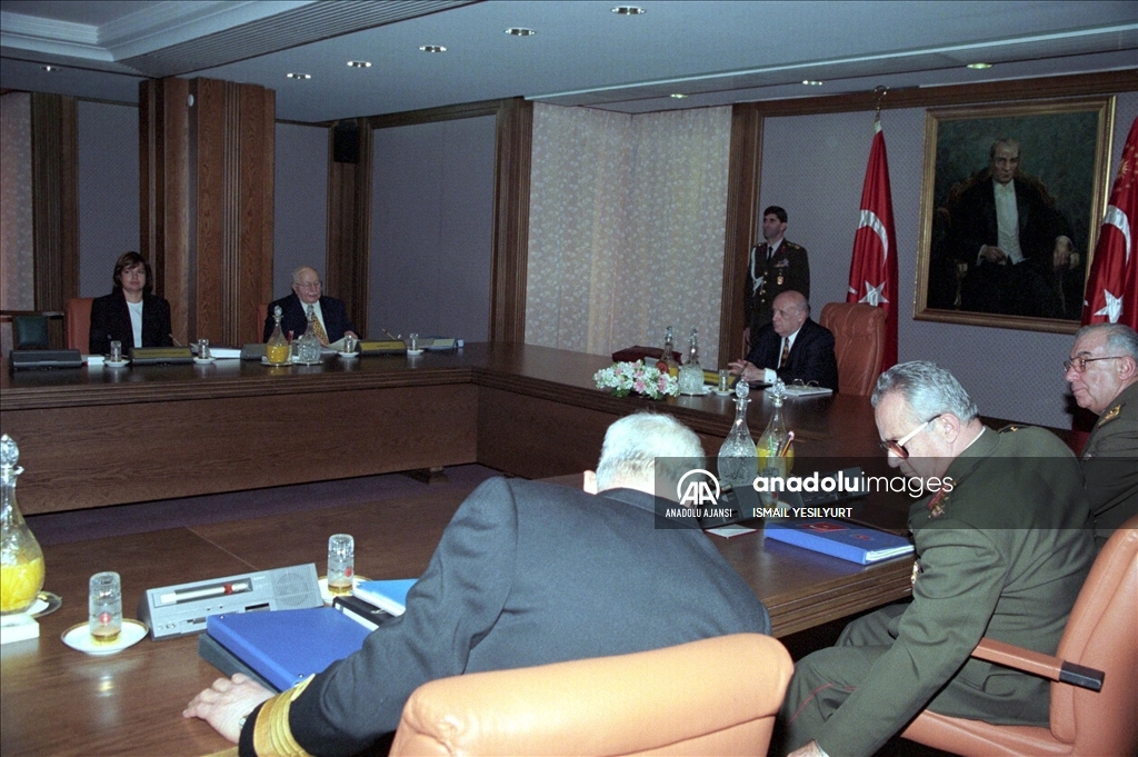 Türk siyasi tarihine "Postmodern darbe" olarak geçen 28 Şubat 1997'deki Milli Güvenlik Kurulu (MGK) toplantısının üzerinden 26 yıl geçti. Milli Güvenlik Kurulu (MGK) Cumhurbaşkanı Süleyman Demirel (sol3) başkanlığında Çankaya Köşkü'nde toplanmış, toplantıya Başbakan Necmettin Erbakan (sol2), Dışişleri Bakanı ve Başbakan Yardımcısı Tansu Çiller (solda), Genelkurmay Başkanı Orgeneral İsmail Hakkı Karadayı (sağda) ve kuvvet komutanları katılmıştı. (Arşiv)