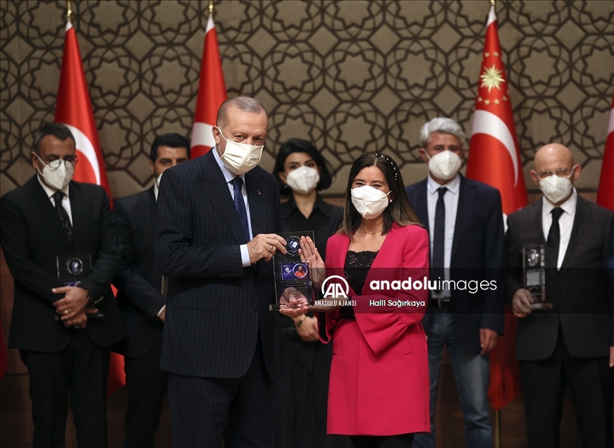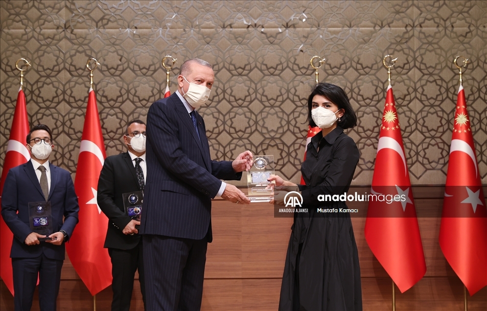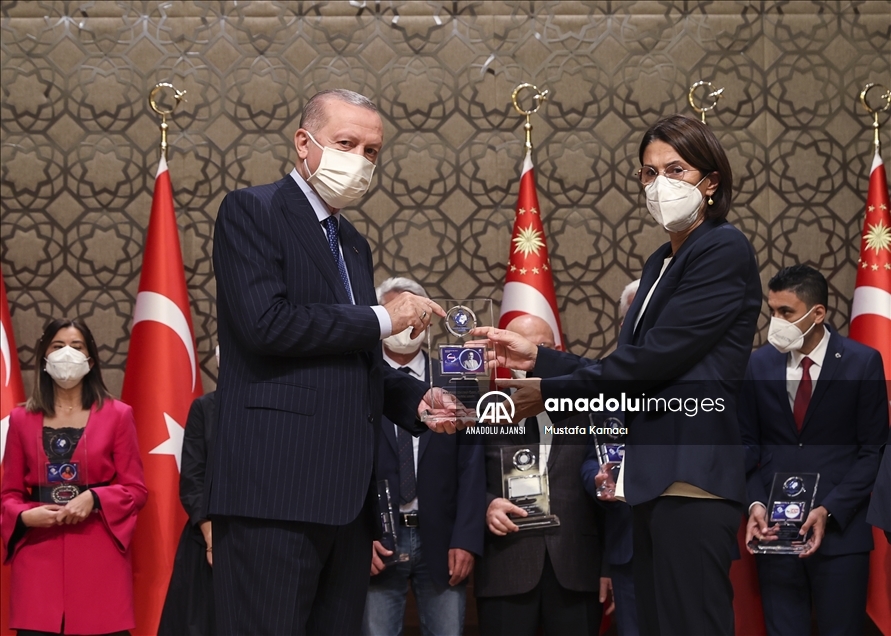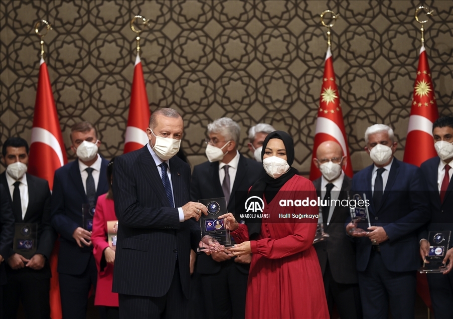 Cumhurbaşkanı Recep Tayyip Erdoğan, Cumhurbaşkanlığı Külliyesi'nde "6. Anadolu Medya Ödülleri" programına katıldı. Cumhurbaşkanı Erdoğan, ödüle layık görülen A Haber Muhabiri Lamia Ayhan'a ödülünü verdi. ( Halil Sağırkaya - Anadolu Ajansı )Halil Sağırkaya