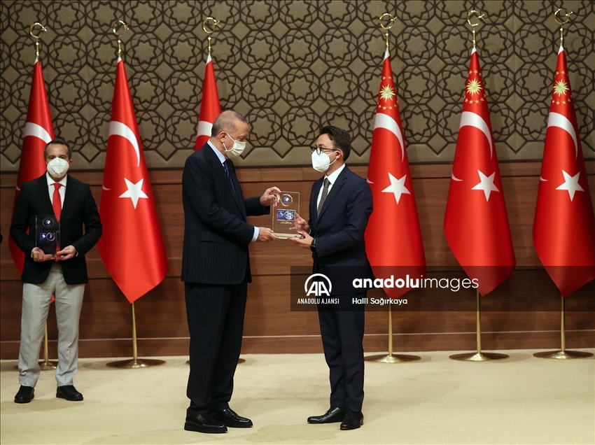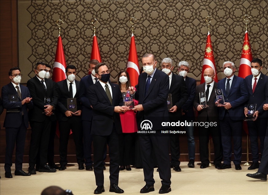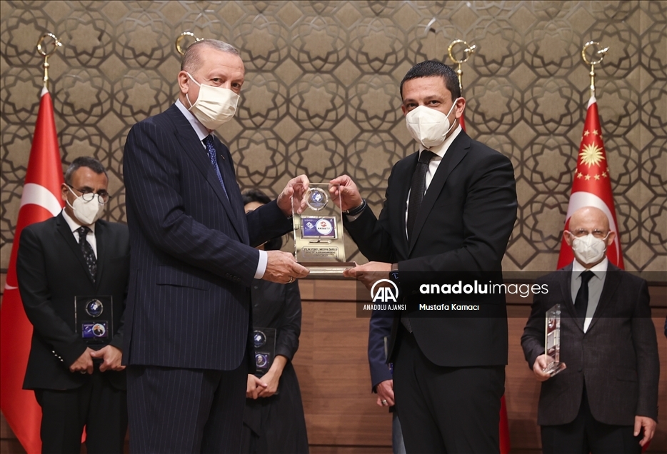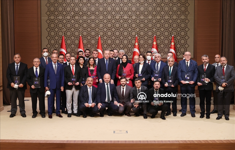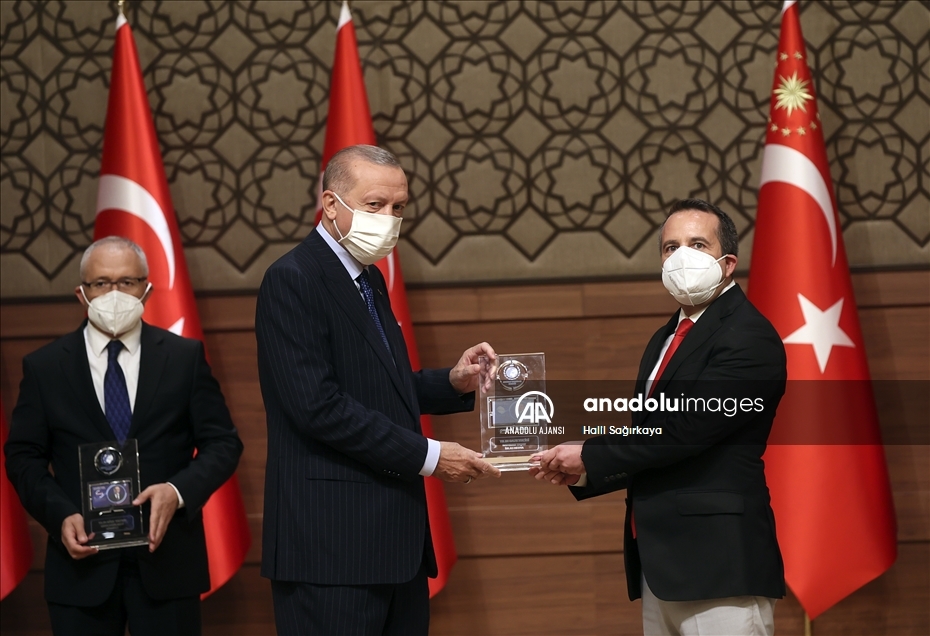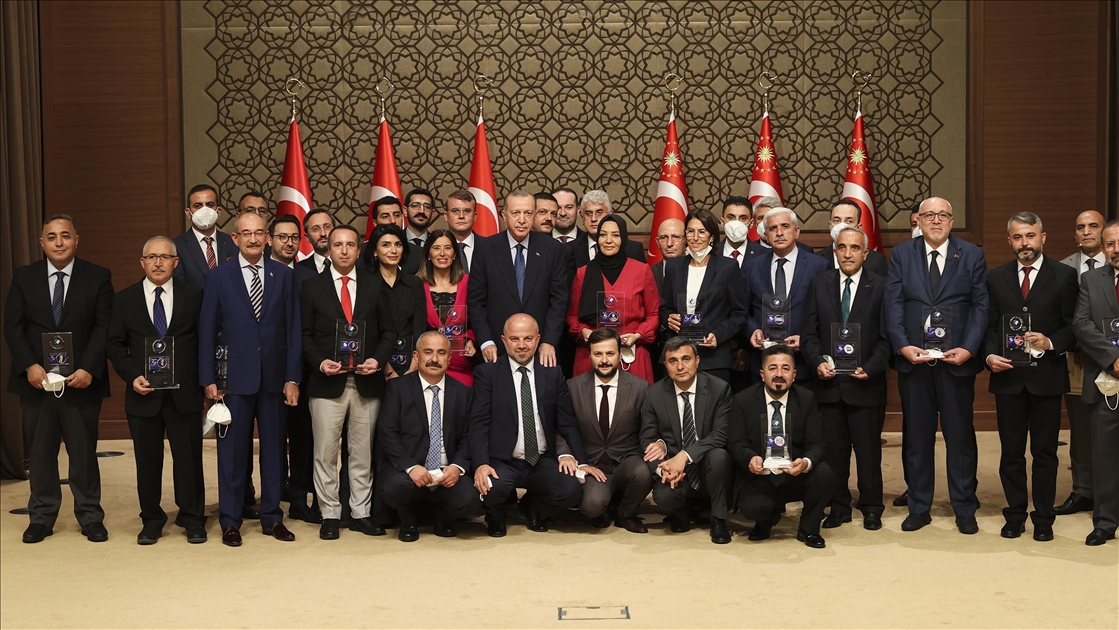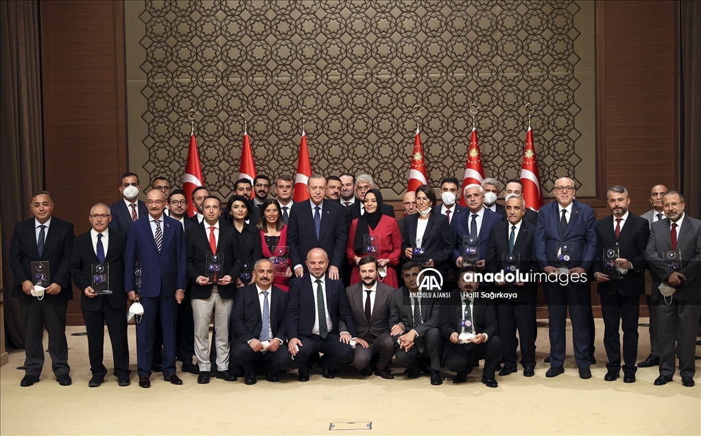Cumhurbaşkanı Recep Tayyip Erdoğan, Cumhurbaşkanlığı Külliyesi'nde "6. Anadolu Medya Ödülleri" programına katıldı. Cumhurbaşkanı Erdoğan, çeşitli kategorilerde ödüle layık görülenlere ödüllerini verdi. ( Mustafa Kamacı - Anadolu Ajansı )Mustafa Kamacı