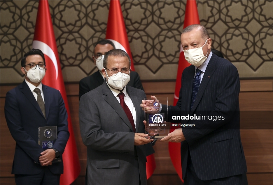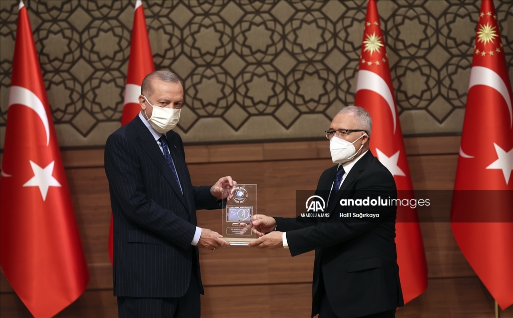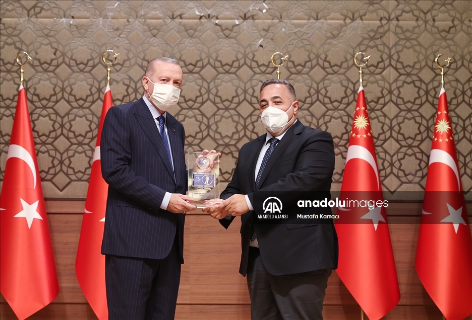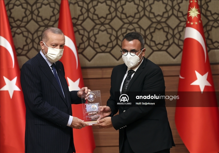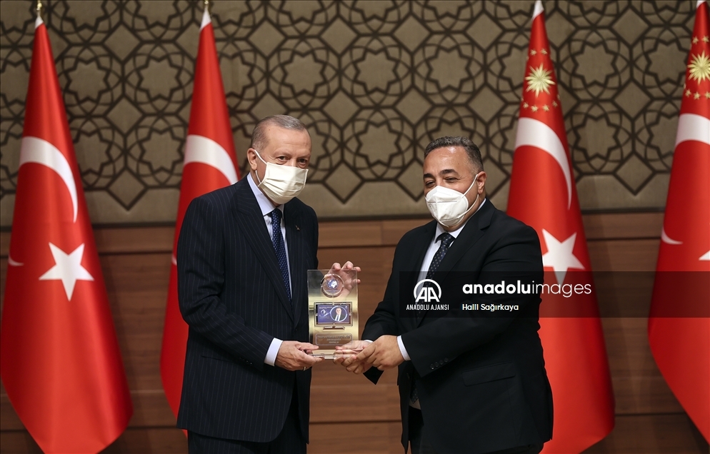 Cumhurbaşkanı Recep Tayyip Erdoğan, Cumhurbaşkanlığı Külliyesi'nde "6. Anadolu Medya Ödülleri" programına katıldı. Cumhurbaşkanı Erdoğan, ödüle layık görülen Kanal 7'den Zahid Akman'a ödülünü verdi. ( Halil Sağırkaya - Anadolu Ajansı )Halil Sağırkaya