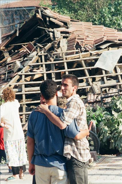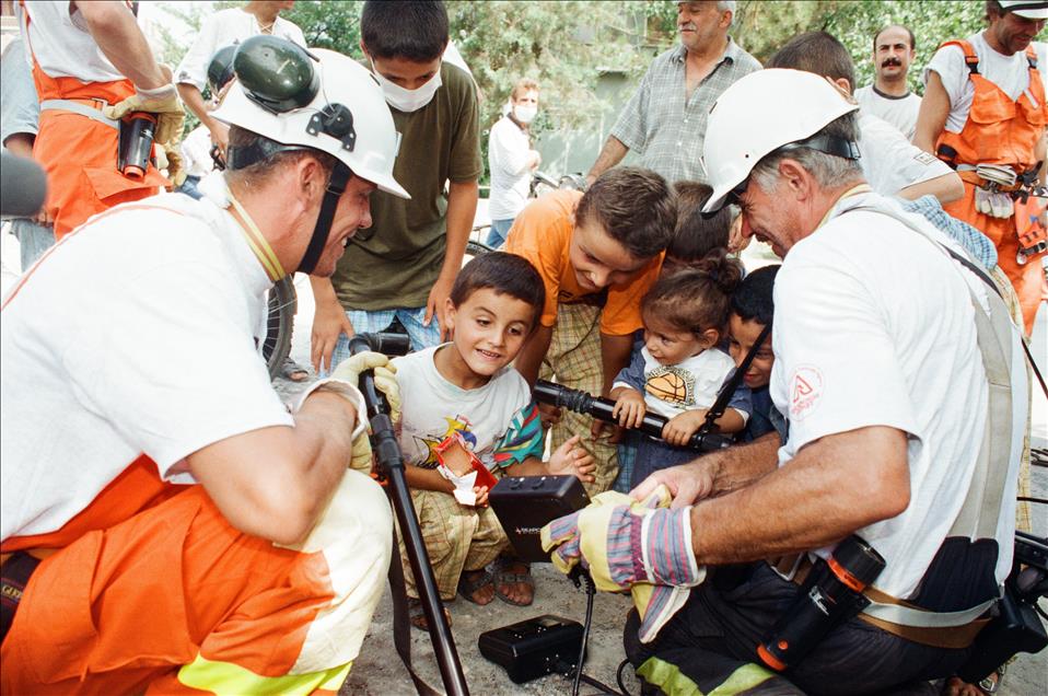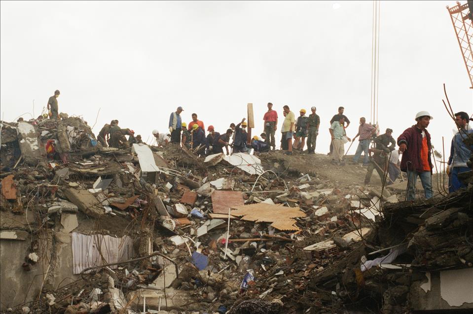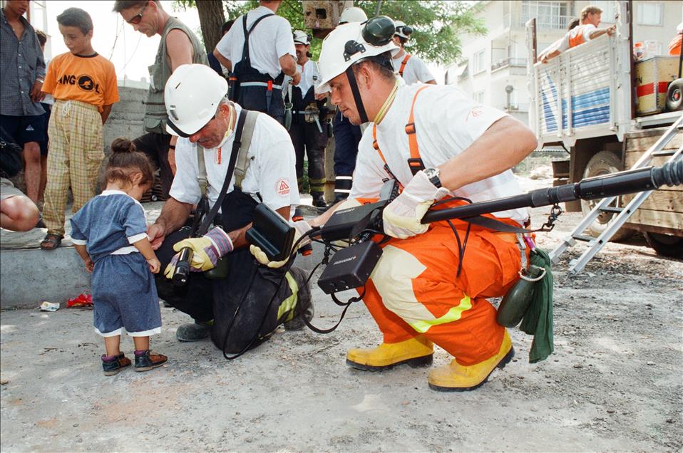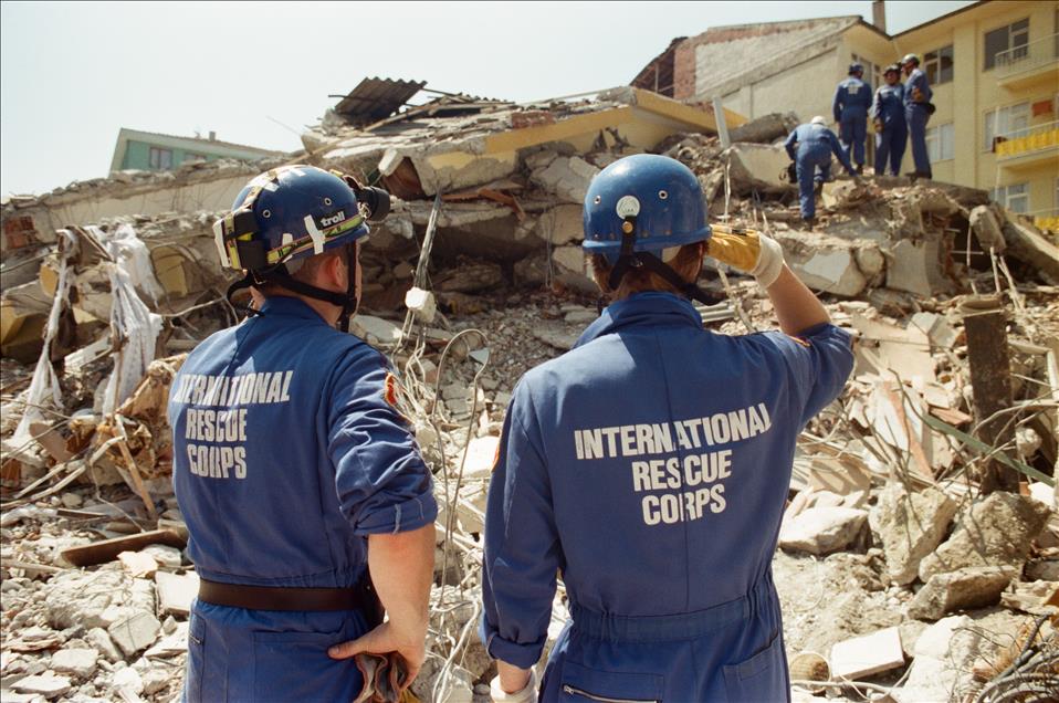 16 yıl önce, 17 Ağustos 1999 sabah 03:02'de merkez üssü Kocaeli’nin Gölcük ilçesi olan Marmara Depremi gerçekleşti. Ankara'dan İzmir'e kadar geniş bir alanda hissedilen deprem sonrası resmi raporlara göre 18 bin 373 kişi öldü, 23 bin 781 kişi yaralandı ve 505 kişi de sakat kaldı. Büyük can ve mal kaybına neden olan depremde 285 bin 211 ev ile 42 bin 902 iş yeri büyük hasar gördü. Türkiye tarihini derinden etkileyen ‘’Marmara Depremi’’nde hayatını kaybedenler için her yıl anma etkinlikleri düzenleniyor. Deprem sonrası Uluslararası kurtarma ekipleri de bölgeye gelerek arama kurtarma çalışmalarına katılmıştı. Fotoğrafta Düzce'de yıkıntılar arasında çalışan İskoçya merkezli İnternational Rescue Corbs ekibi görülüyor. (Arşiv) (Kenan Gürbüz - Anadolu Ajansı)Kenan Gürbüz