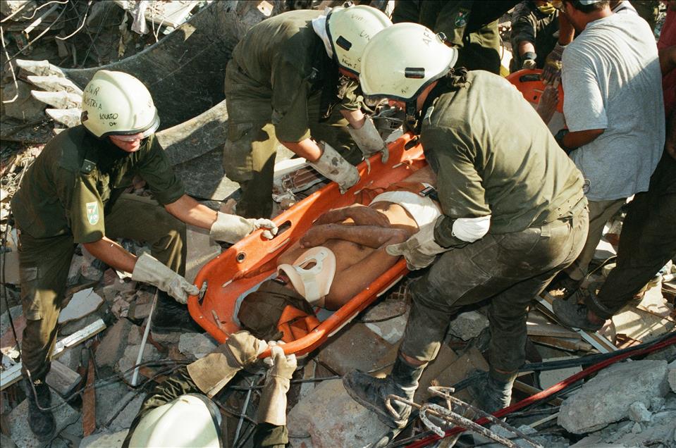 16 yıl önce, 17 Ağustos 1999 sabah 03:02'de merkez üssü Kocaeli’nin Gölcük ilçesi olan Marmara Depremi gerçekleşti. Ankara'dan İzmir'e kadar geniş bir alanda hissedilen deprem sonrası resmi raporlara göre 18 bin 373 kişi öldü, 23 bin 781 kişi yaralandı ve 505 kişi de sakat kaldı. Büyük can ve mal kaybına neden olan depremde 285 bin 211 ev ile 42 bin 902 iş yeri büyük hasar gördü. Türkiye tarihini derinden etkileyen ‘’Marmara Depremi’’nde hayatını kaybedenler için her yıl anma etkinlikleri düzenleniyor. Deprem sonrası Uluslararası kurtarma ekipleri de bölgeye gelerek arama kurtarma çalışmalarına katılmıştı. Fotoğrafta yıkıntılar arasında çalışan kurtarma ekipleri görülüyor. (Arşiv)