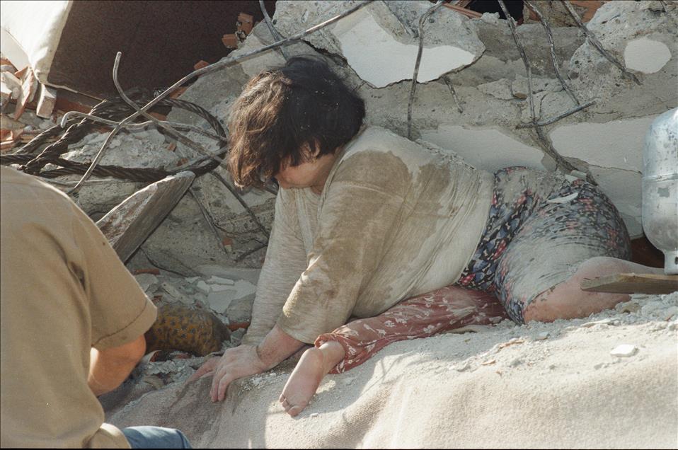 16 yıl önce, 17 Ağustos 1999 sabah 03:02'de merkez üssü Kocaeli’nin Gölcük ilçesi olan Marmara Depremi gerçekleşti. Ankara'dan İzmir'e kadar geniş bir alanda hissedilen deprem sonrası resmi raporlara göre 18 bin 373 kişi öldü, 23 bin 781 kişi yaralandı ve 505 kişi de sakat kaldı. Büyük can ve mal kaybına neden olan depremde 285 bin 211 ev ile 42 bin 902 iş yeri büyük hasar gördü. Türkiye tarihini derinden etkileyen ‘’Marmara Depremi’’nde hayatını kaybedenler için her yıl anma etkinlikleri düzenleniyor. Deprem sonrası Sefaköy'de çöken yedi katlı bir apartmandan sağ çıkarılan Ümran Cavaş... (Arşiv)