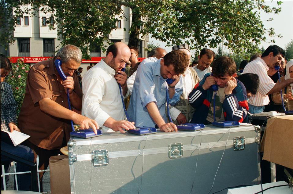 16 yıl önce, 17 Ağustos 1999 sabah 03:02'de merkez üssü Kocaeli’nin Gölcük ilçesi olan Marmara Depremi gerçekleşti. Ankara'dan İzmir'e kadar geniş bir alanda hissedilen deprem sonrası resmi raporlara göre 18 bin 373 kişi öldü, 23 bin 781 kişi yaralandı ve 505 kişi de sakat kaldı. Büyük can ve mal kaybına neden olan depremde 285 bin 211 ev ile 42 bin 902 iş yeri büyük hasar gördü. Türkiye tarihini derinden etkileyen ‘’Marmara Depremi’’nde hayatını kaybedenler için her yıl anma etkinlikleri düzenleniyor. Depremzedeler yakınlarına telefonla haber verebilmek için uzun kuyruklar oluşturmuştu. (Arşiv)