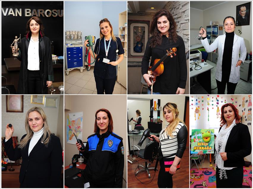 Van'da 8 farklı meslek grubunda çalışan 8 iş kadını, çalışma hayatının zorluğunu, meslekteki güzel anılarını, kadına yönelik şiddeti, kadının toplumdaki yerini değerlendirdi. Van'da 8 yıldan bu yana avukatlık yapan Aslı Gencer (Üst sıra solda), Van Bölge Eğitim ve Araştırma Hastanesi'nde görevli hemşire Merve Yılmazer ( Üst sıra sol 2), 12 yıldır müzikle uğraşan keman eğitmeni Bahar Özgüner (Üst sıra sağ 2), 7 yıldır sağlık hizmeti veren Doktor Mehpare Altay (Üst sıra sağda), 2009 yılında yapılan yerel seçimlerde, Van'ın ilk ve tek kadın muhtarı olarak seçilen Leyla Tanrıtanır (Alt sıra solda), 13 yıldan bu yana polis memurluğu yapan ve Van'da Toplum Destekli Polislik Şubesi'nde sürekli vatandaşlarla diyalog içinde olan Dudu Erbilgiç ( Alt sıra sol 2), Doğu Anadolu Bölgesi'nin tek kadın saç ekim uzmanı olan Fatma Berna Seven (Alt sıra sağ 2) ve Doğu coğrafyasında dünyaya geldiğini, buranın bütün zorluklarını yaşadığını anlatan 14 yıllık öğretmen Elif Delen (Alt sıra sağda), konuyla ilgili, AA muhabirine açıklamada bulundu. (Özkan Bilgin - Anadolu Ajansı)Özkan Bilgin