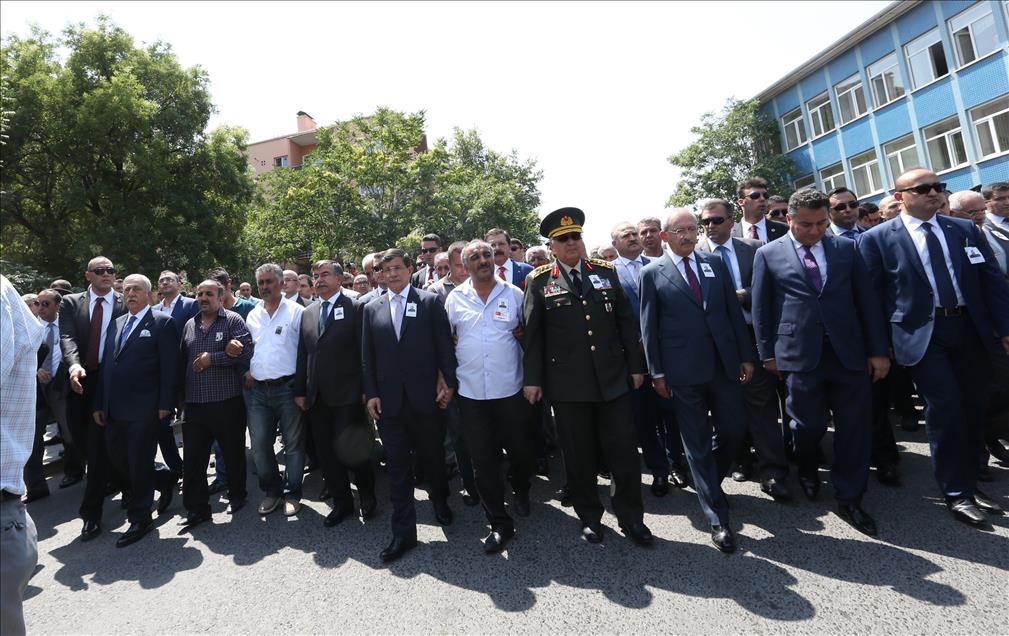 Şırnak'ta, bölücü terör örgütü mensuplarının düzenlediği saldırıda şehit edilen 3 askerden birisi olan şehit Piyade Onbaşı Hamza Yıldırım için Kocatepe Camii'nde Cuma namazını müteakip kılınan cenaze namazının ardından tören düzenlendi. Törene, Başbakan Ahmet Davutoğlu (sol 6), şehidin babası Haşim Yıldırım (sol 7), Genelkurmay Başkanı Orgeneral Necdet Özel (sol 8), Başbakan Yardımcısı Ali Babacan (solda), CHP Genel Başkanı Kemal Kılıçdaroğlu (sol 4), Gıda, Tarım ve Hayvancılık Bakanı Mehdi Eker (sol 2), şehidin yakınları ve askeri erkan ve çok sayıda vatandaş katıldı. (Halil Sağırkaya - Anadolu Ajansı)Halil Sağırkaya