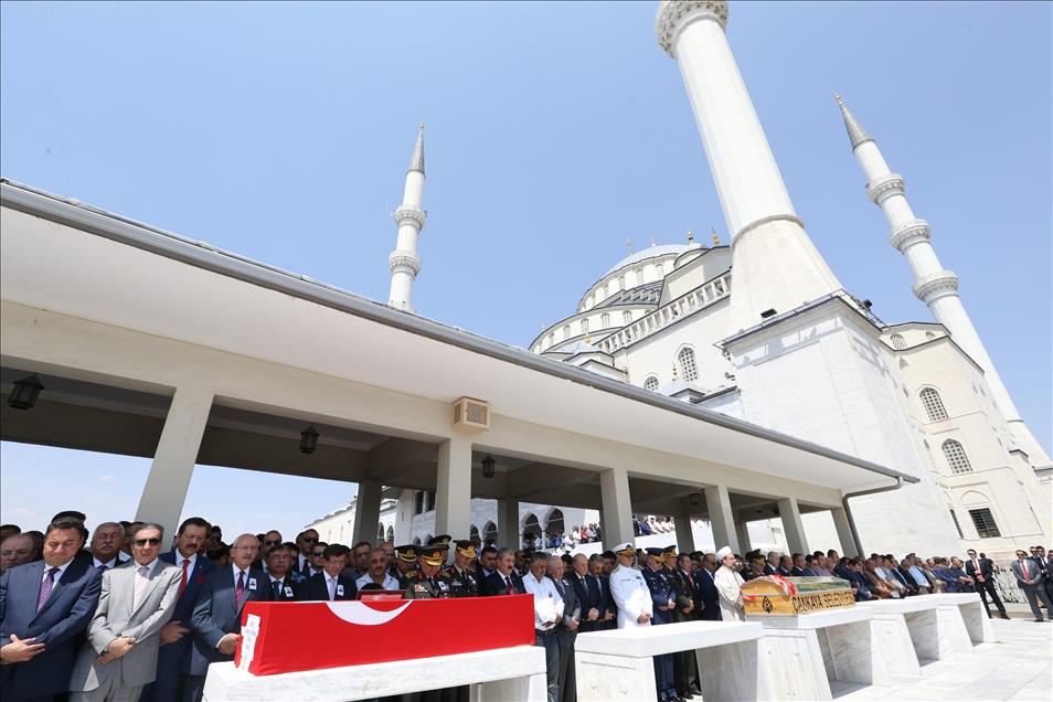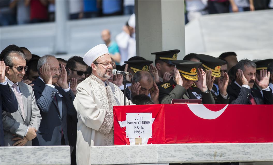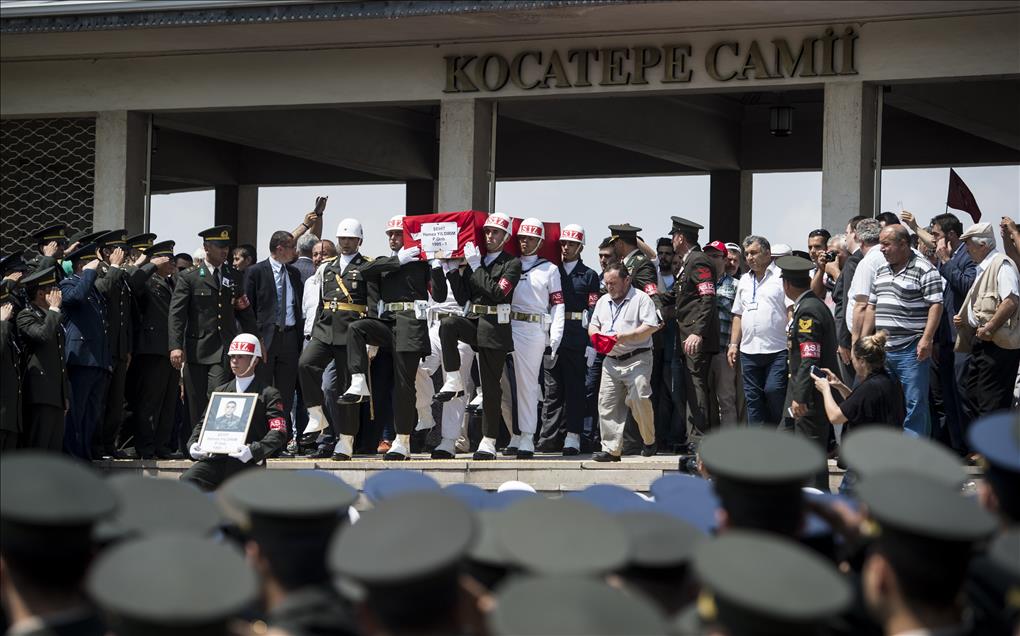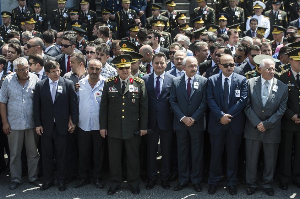 Şırnak'ta, bölücü terör örgütü mensuplarının düzenlediği saldırıda şehit edilen 3 askerden birisi olan şehit Piyade Onbaşı Hamza Yıldırım için Kocatepe Camii'nde Cuma namazını müteakip kılınan cenaze namazının ardından tören düzenlendi. Törene, Başbakan Ahmet Davutoğlu (sol 2), şehidin babası Haşim Yıldırım (sol 3), Genelkurmay Başkanı Necdet Özel (sol 4), Başbakan Yardımcısı Ali Babacan (sağ 4), CHP Genel Başkanı Kemal Kılıçdaroğlu (sağ 3), Başbakan Yardımcısı Yalçın Akdoğan (sağ 2), şehidin yakınları ve askeri erkan katıldı. (Mustafa Kamacı - Anadolu Ajansı)Mustafa Kamacı
